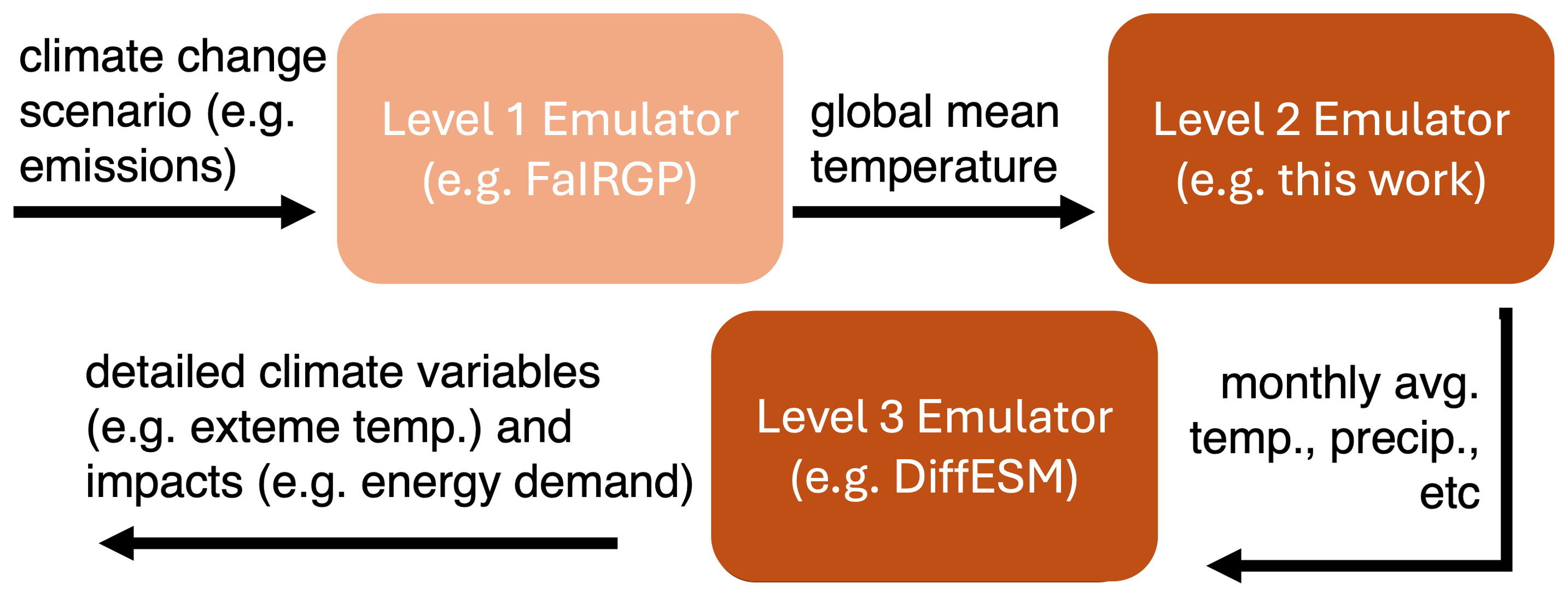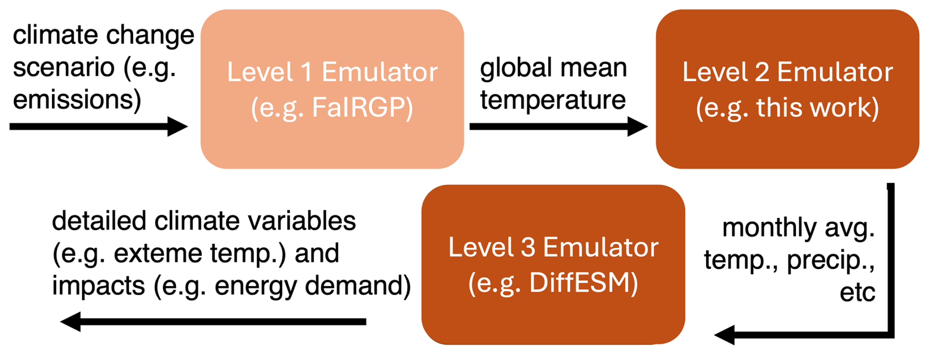 Emulators of ESMs have been gaining popularity as a way to facilitate access to climate projections. Here, we consider the class of emulators trained on the output of ESMs to cheaply and quickly predict the climate response to arbitrary climate change scenarios. We will not consider other types of emulators that are being actively pursued for other applications, including climate model downscaling, parametrization of subgrid-scale processes, and model parameter calibration (e.g, Doury et al.2023; Li et al.2019; Lai et al.2025; Peatier et al.2022; Tebaldi et al.2025). From here on, the term emulator will refer exclusively to the class of emulators trained to extend ESMs to arbitrary future scenarios. The importance of these emulators is likely to rise due to the increasing computational demands of ESMs: their ever refining spatial resolution, their growing complexity (as embodied by the number of model components and their sophistication), the use of more accurate numerical methods (Griffies et al.2020; Souza et al.2023; Taylor et al.2023; Silvestri et al.2024), and the push to run larger ensembles of simulations differing in initial conditions (Schneider et al.2024, 2023). Emulators are necessary to both compress existing information into a more manageable form as well as to bridge the gap between the computational demand of running a full ESM and the computational hardware available to everyday consumers of climate information. This need is best illustrated by the evidence that projections of future emissions are updated every year, while a new deck of ESM simulations by CMIP takes close to a decade to generate and organize for community sharing.