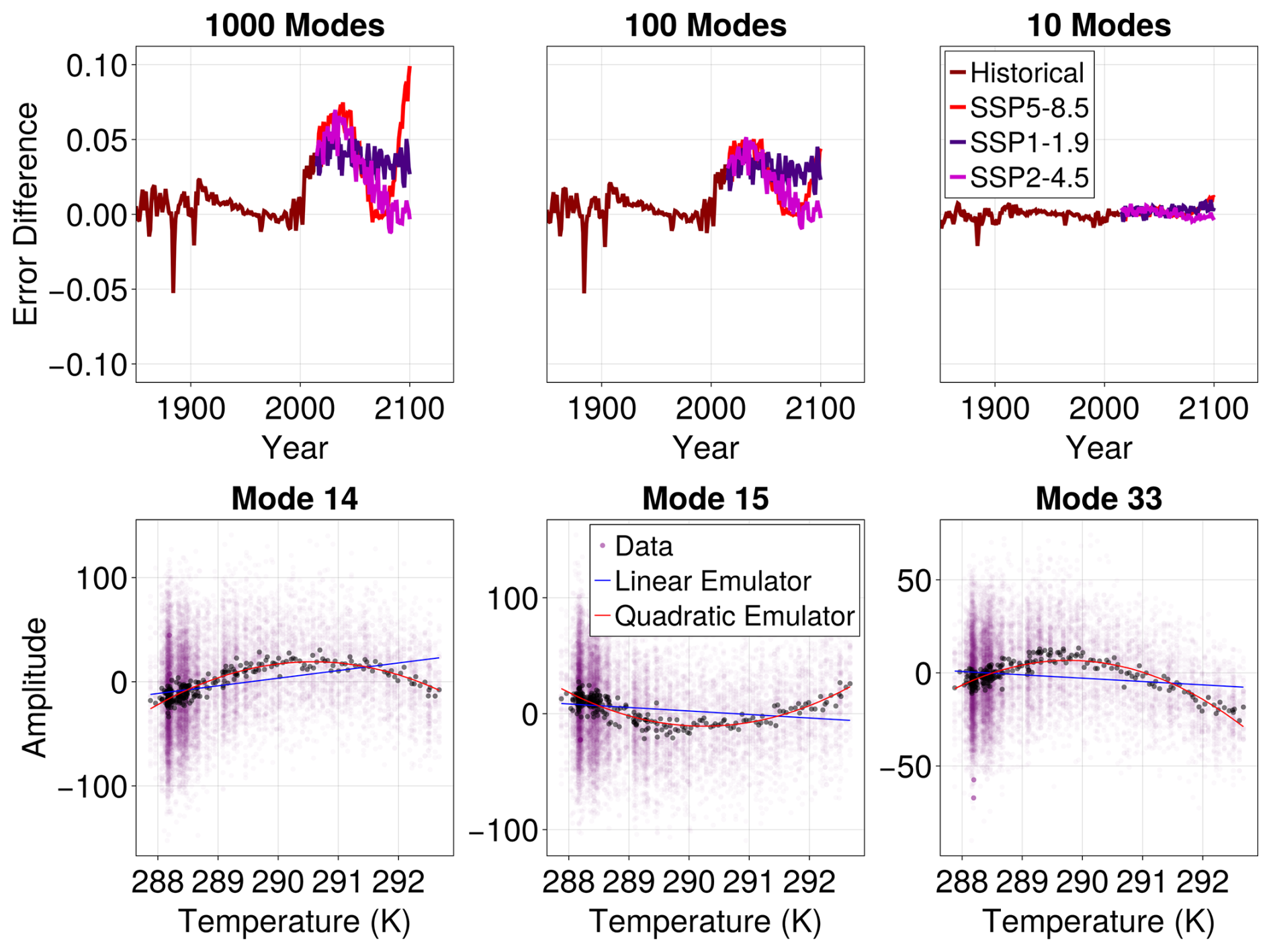 Thus our emulator would reduce to linear pattern scaling for the ensemble mean temperature at a point if we were to sum over all EOF modes and choose a linear fit, rather than a quadratic one, for the mean of their amplitudes (i.e. force T2 to be zero); we illustrate this in Appendix C.