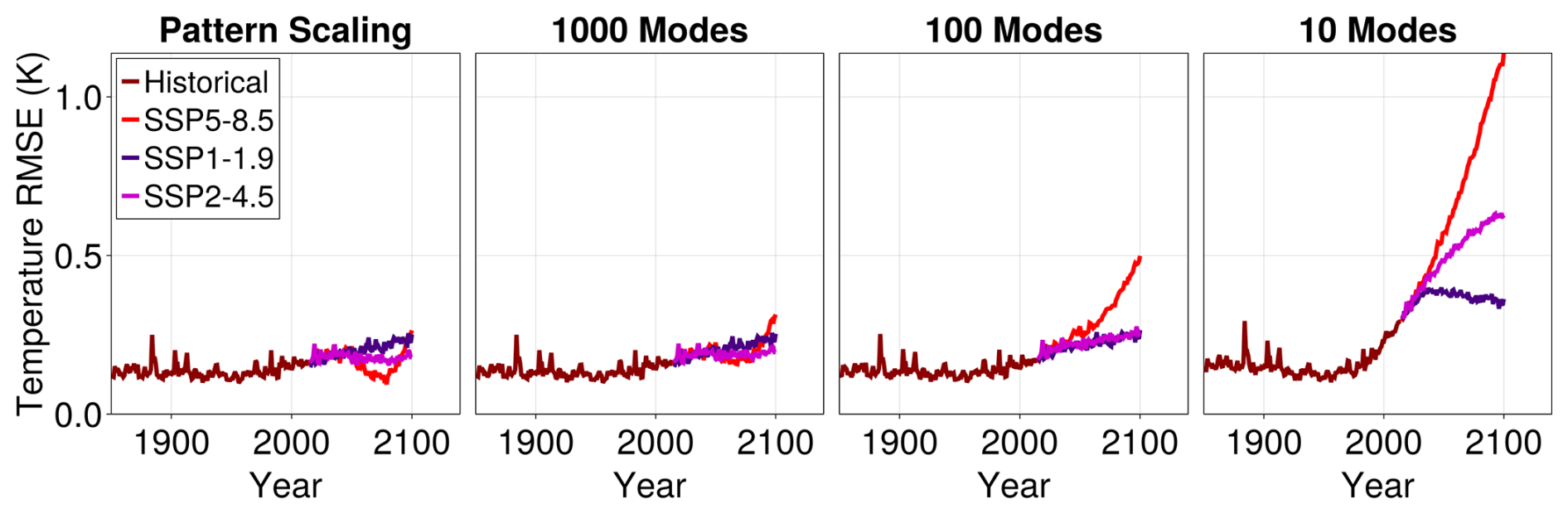Our approach, however, expands beyond pattern scaling in three important ways. First, our focus is on performing regression on modal amplitudes of the largest and most robust spatial patterns of the climate model output, which are given by suitably coarse-grained basis functions rather than pointwise measurements. We use a sufficiently large basis such that we can still represent pointwise values but ignore small-scale spatial patterns, whose representations in ESMs are typically quite uncertain.