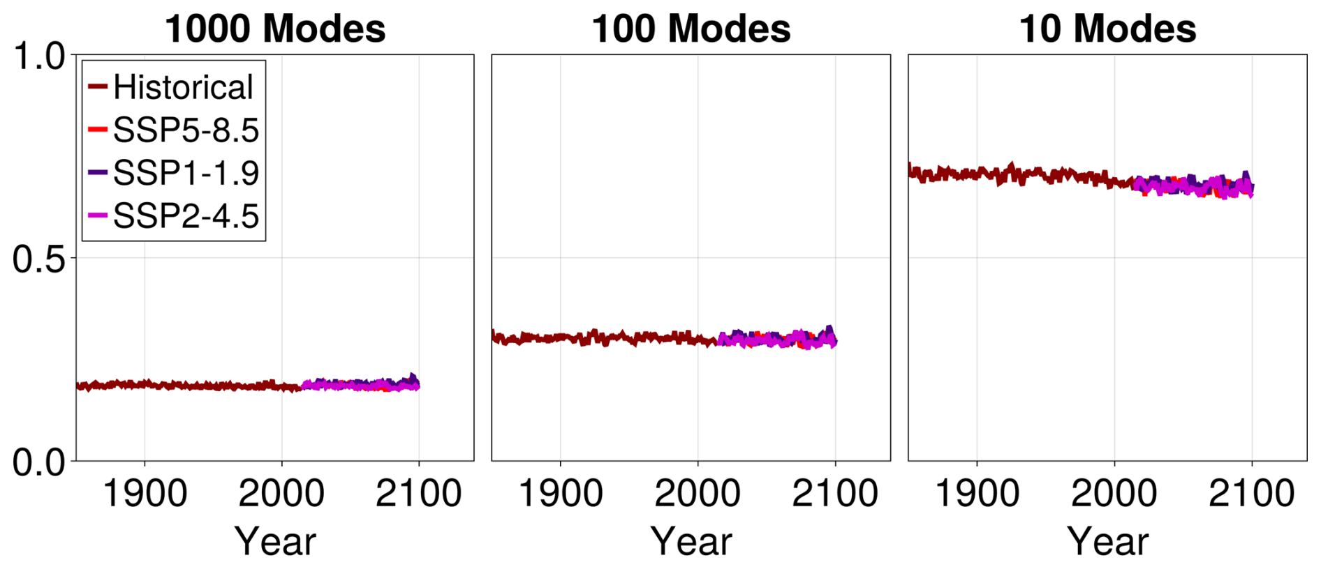 Second, our emulator produces more than the ensemble mean since it also accounts for covariances across EOF modes. This is no trivial point since the value of a physical variable is meaningless without an estimate of its uncertainty, or internal variability. For example, as mentioned in the Introduction, estimates of the time when the forced climate response of a climate variable emerges from internal variability (the ToE) require emulators of both means and variances. It may be argued that the linear pattern scaling approach can also be used to predict the temperature variance at each location as a linear function of the global, yearly, and ensemble mean temperature. However, a new linear fit must be computed if one wishes to estimate the variance over a wider region (for example) because it requires knowing correlations between different points. With our emulator, we can reconstruct a much larger range of statistics of the field in question from the mean and covariance estimates of the modal amplitudes without any additional fitting.
