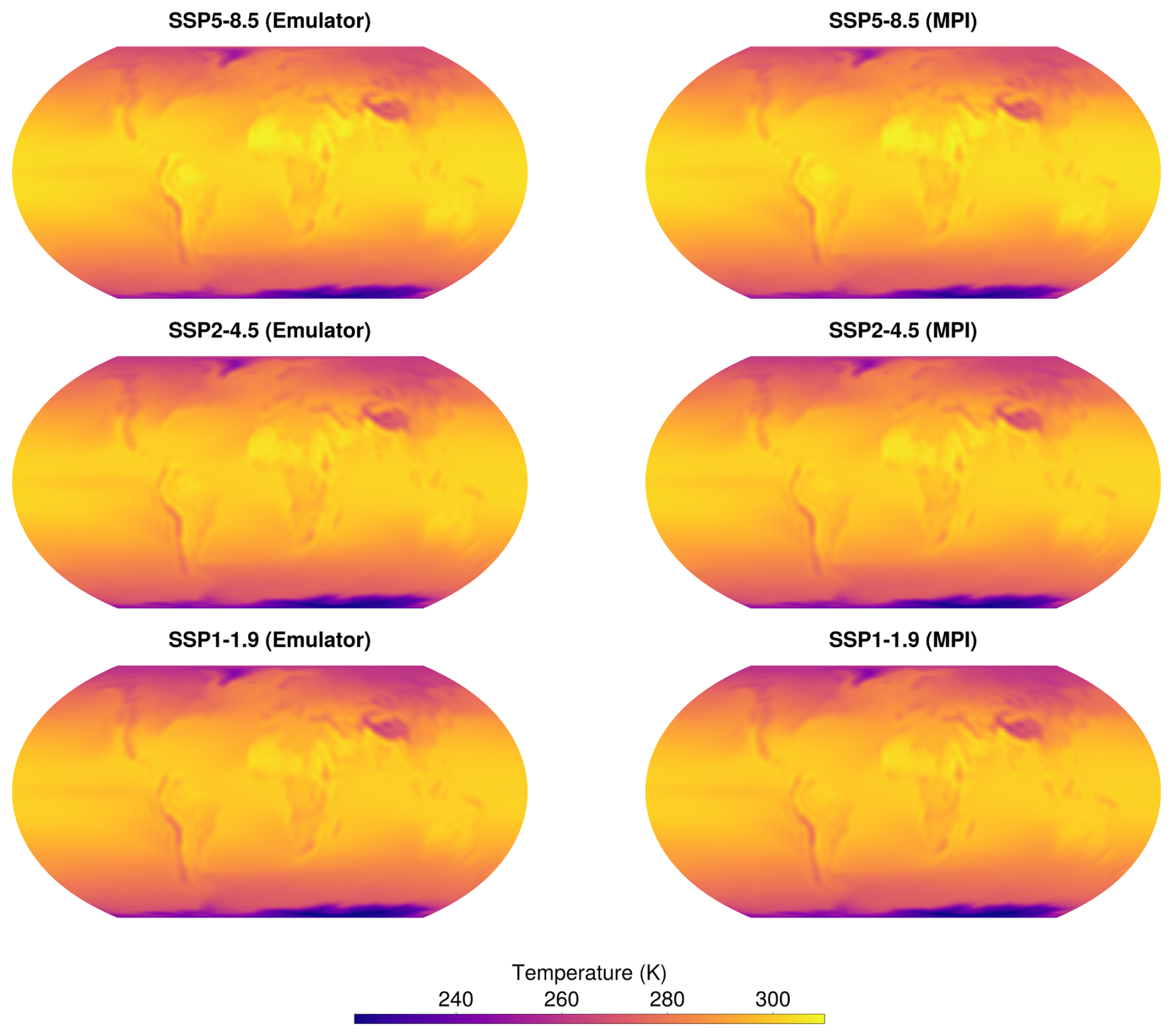 Now that we have described the design of our emulator, it is time to validate its performance. The emulator is trained on the historical period and the SSP5-8.5 future scenario of the MPI ESM-1.2-LR model. The testing is performed by (a) applying it to other scenarios run by the MPI model that were not used in training and (b) using it to compute various statistics of interest. We use the SSP2-4.5 and SSP1-1.9 as our “test” scenarios.