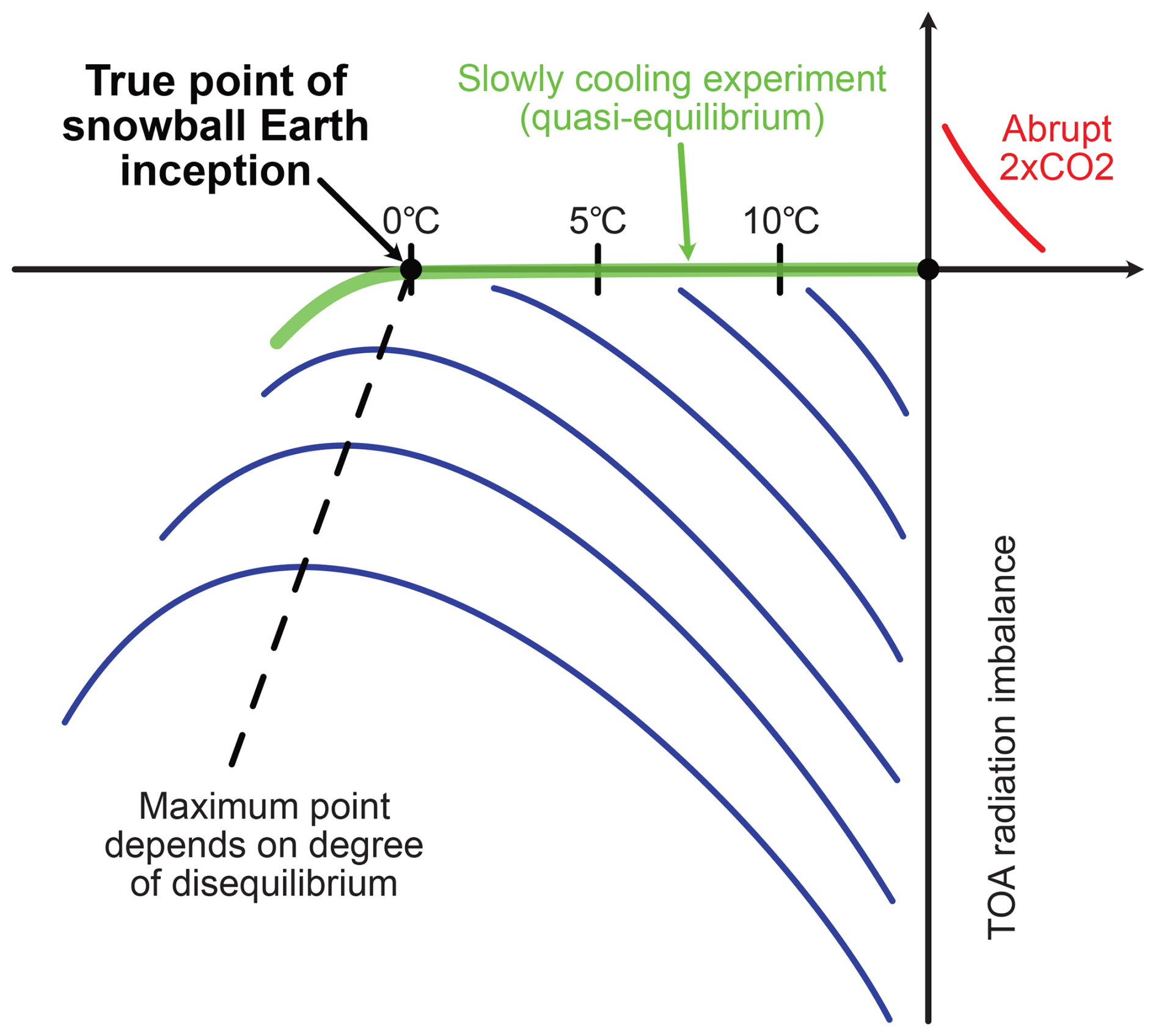 In the real climate system, the climate would slowly cool down as the forcing from the Sun or greenhouse gases change only slowly over time. Such transitions and abruptly forced simulations are illustrated in Fig. 1. When a negative forcing is slowly applied, for instance if CO2 is slowly decreasing over time, the climate system would maintain a quasi-equilibrium and move along the green line to colder temperatures, until the true instability leading to a snowball Earth state is reached. In our simulations, the point closest to equilibrium, i.e. the least negative TOA imbalance, serves as to estimate the transition value. If a simulation was to be brought to higher CO2 concentration, it is at this point that the equilibrium would be reached first. Because the simulations miss this equilibrium point, and since any other year is further out of balance than the year at this equilibrium point, they will not reach any other equilibrium until a new climate state, most likely the snowball Earth state, is found. Therefore, we can estimate the model's transition temperature towards snowball Earth as the temperature of the year with the least negative TOA imbalance. By definition it is also the year where the total climate feedback would be strictly zero before turning positive, which is represented by the tangential line in the Gregory et al. (2004) framework.