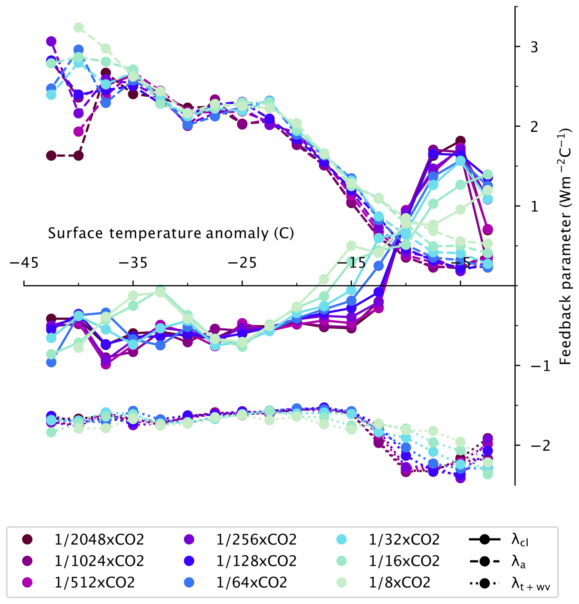 During the history of Earth, geological evidences support the formation of persistent sea ice within the tropical regions, referred to as snowball Earth states (e.g. Hoffman et al., 2017). Because ice is highly reflective, the positive surface albedo feedback strengthens and exceeds the sum of other feedbacks while the Earth cools down. The evolution of the strength of climate feedbacks as a function of temperature is referred to as temperature-dependency. Whilst climate models agree that the surface albedo feedback increases in cold climates (e.g. Budyko, 1969), other climate feedbacks such as clouds are less understood in the context of cooling (e.g. Braun et al., 2022). Temperature-dependency in climate feedbacks has often been studied in warming climates (e.g. Caballero and Huber, 2013; Jonko et al., 2013; Meraner et al., 2013), but rarely in cold climates (e.g. Colman and McAvaney, 2009).