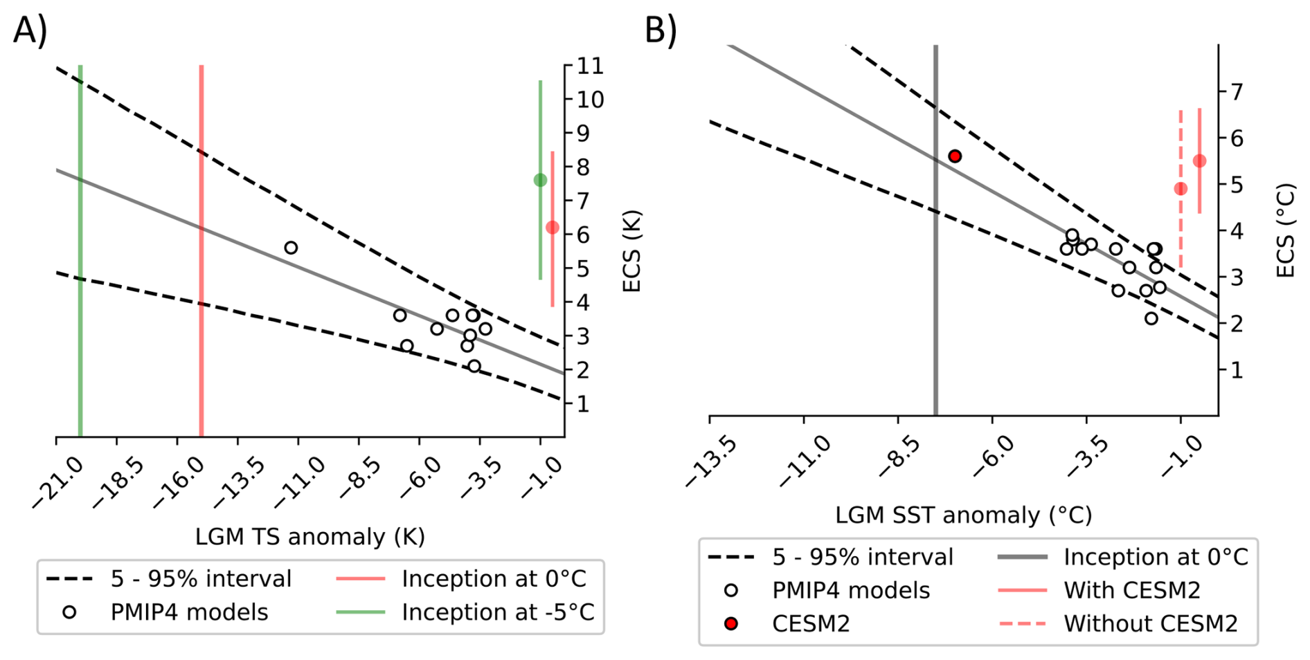 Figure 7Relationship between modelled LGM surface temperature anomaly relative to pre-industrial (PI) and the climate sensitivity of PMIP4 models. The upper bound on climate sensitivity can be constrained using the temperature at which the climate starts transiting to snowball Earth, which is different whether it is from surface temperatures or sea-surface temperatures. In (A), the threshold is around −15 °C global mean surface temperature anomaly relative to PI (red), and in (B), the corresponding threshold as seen in sea-surface temperatures is around −7.5 °C relative to PI (grey). Several sensitivity tests for the computation of the upper bound on climate sensitivity are shown: (A) if the upper bound of the transition was instead at −20 °C relative to PI (green), and (B) if CESM2 is left out of the ensemble, but the other CESM models are included, where only sea-surface temperatures are available.