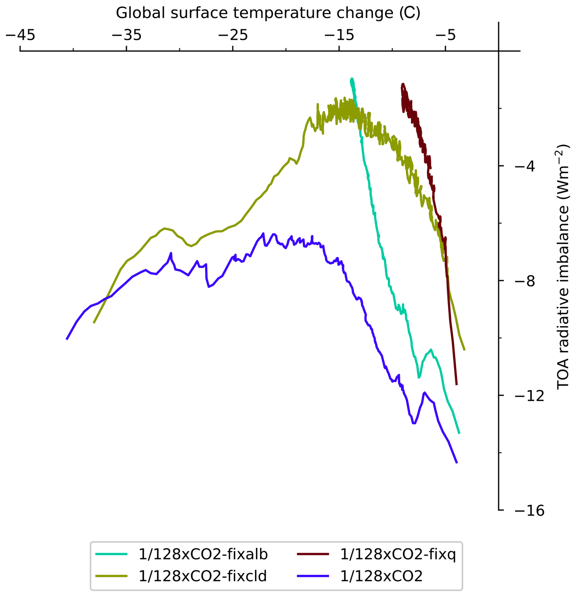 Figure C2Top-of-atmosphere radiative imbalance vs. global surface temperature anomaly relative to PI conditions for the simulation with either surface albedo (fixalb), water vapor (fixq) or cloud (fixcld) feedbacks locked to that of the control state.