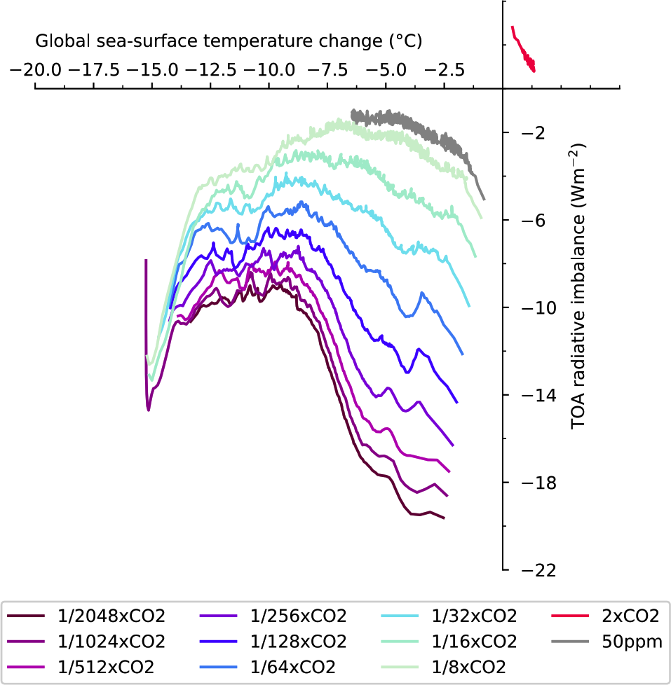 We analyse the evolution of our simulations by studying how the top-of-atmosphere (TOA) energetic imbalance changes with surface temperature. This approach is shown in Figs. 4 and 6 and has been first developed by Gregory et al. (2004). Here, each point of data is a one-year global average of the simulation as it responds to an initial and abruptly applied forcing. Because the total feedback is negative near the stable and stationary pre-industrial state, the system will attempt to reduce the TOA imbalance when exposed to positive or negative forcing. Consequently, in the case of an initial negative forcing from reduced CO2 levels, the climate cools down. Therefore, the beginning of the simulation is where the temperature difference to PI is the closest to zero, and the imbalance is close to the forcing imposed. The end of the simulation is the left-most point, when the temperature anomaly relative to PI conditions is the largest.