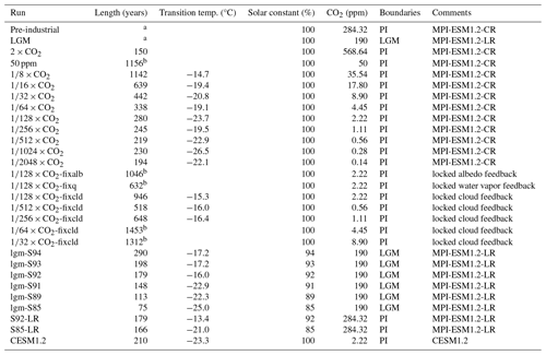 Table 1Summary of the runs performed for this study. PI = Pre-industrial, LGM = Last Glacial Maximum. Solar constant is expressed in percentage of PI solar constant (1361 Wm−2). Transition temperatures are reported as anomalies relative to PI.