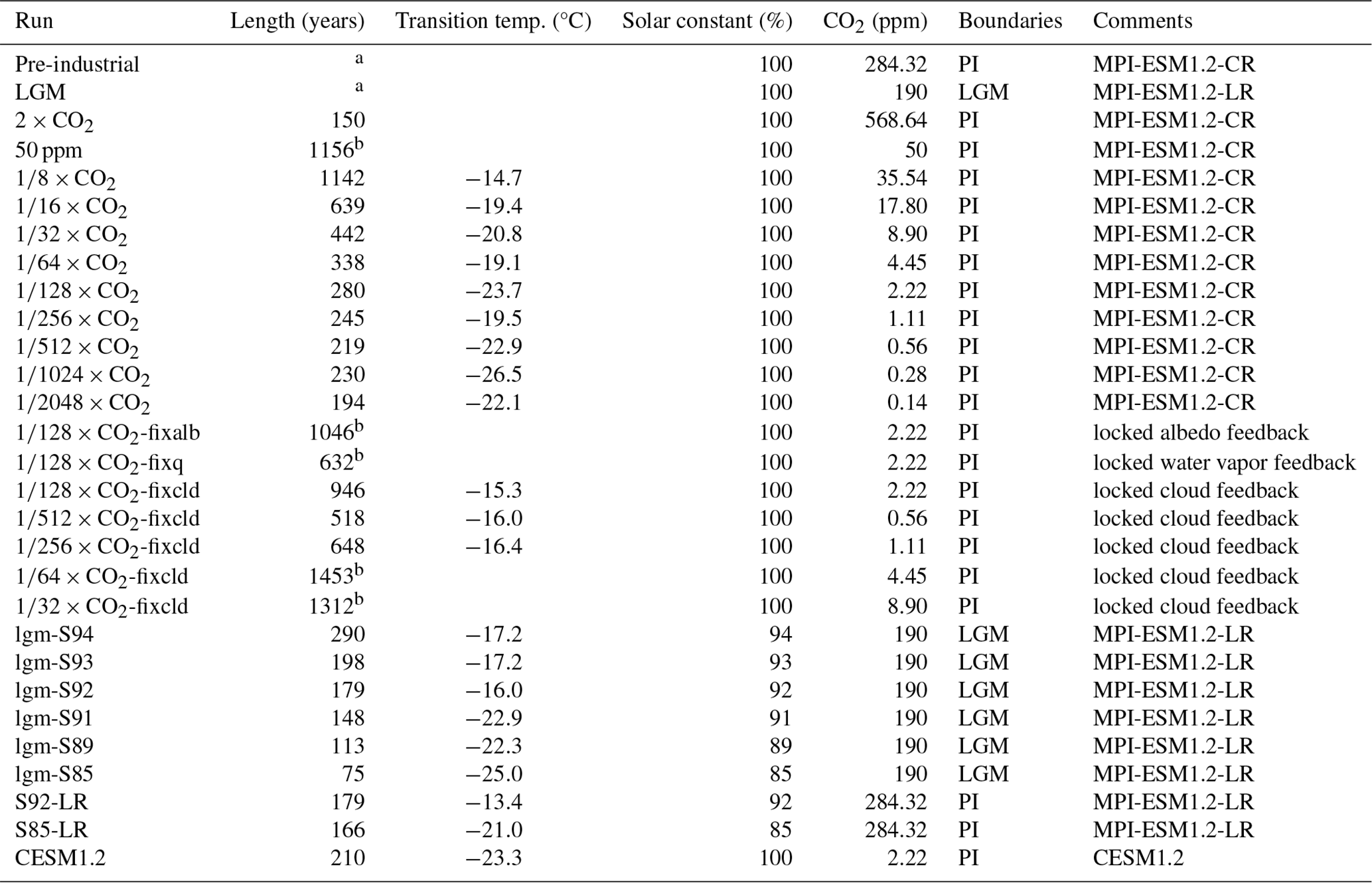 a The runs started from an equilibrium state and ran for 100 years. b The runs were manually stopped and are expected to reach equilibrium in a cold non-snowball state. If the transition temperature is left empty, the simulation did not transit towards a snowball Earth during the years simulated.