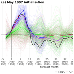 The case of May 1997 (Fig. 7a) is particularly relevant as the 1997–1998 Niño event was exceptionally strong (Trenbeth et al., 2002), with widespread global impacts (McPhaden, 1999; Rojas et al., 2014). The SP correctly captured the evolution of OBS during the forecast months 1–6. Similarly, the MP accurately predicted the development and peak of the El Niño event, with the maximum occurring around December 1997, when the observed Niño3.4 index reached around +3 °C. In contrast, the DP initialised in late 1996 indicated a positive ENSO phase but with a much lower amplitude (around +1.2 °C). As expected, the uninitialised HIST ensemble showed no clear ENSO signal and failed to capture the event.