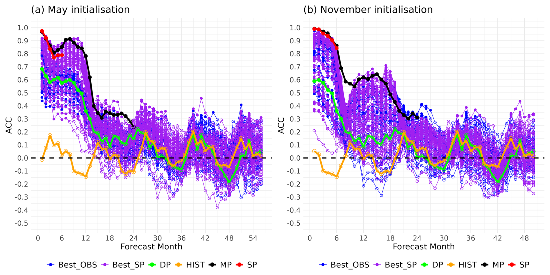 Figures 3–5 show the ACC of Best, and its comparison with different reference forecasts (SP, MP, DP and HIST) through the residual ACC, but the actual ACC values of such reference forecasts are presented in Figs. S10–S12 in the Supplement. In addition, the results for the November initialisation are also provided in the Supplement (Figs. S13–S18).