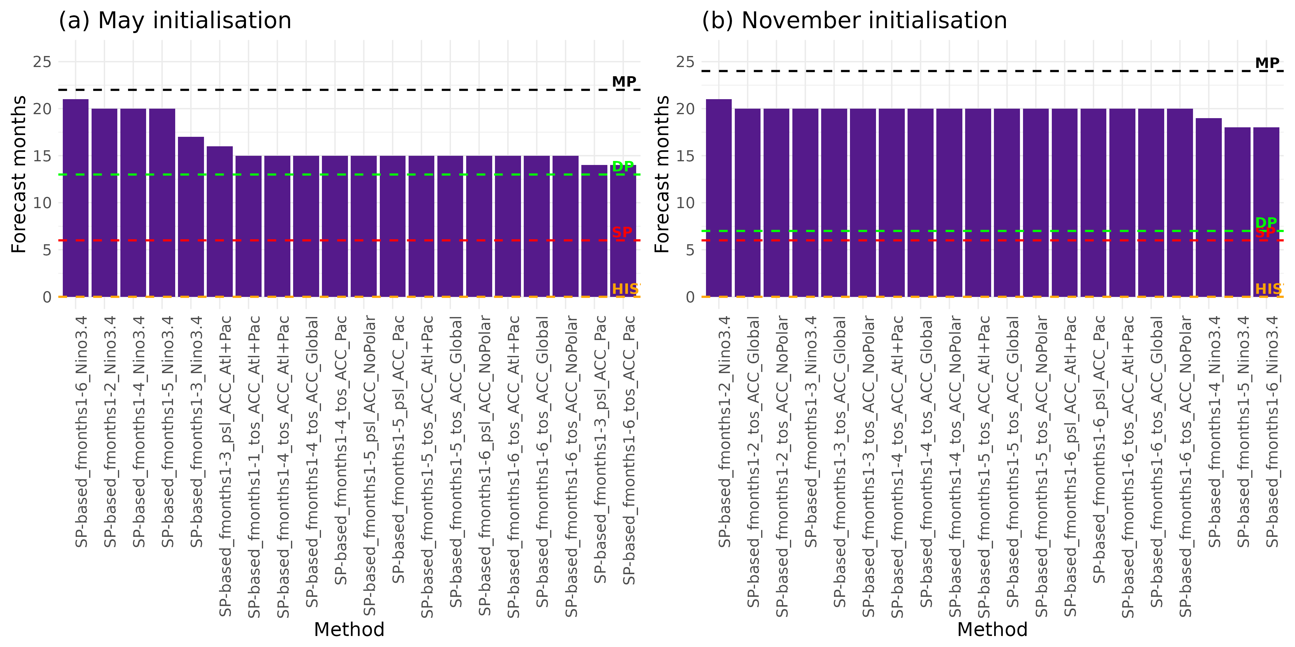 Smaller differences among the top-ranked methods are found for the November initialisation (Fig. 2b). In this case, the best method shows significant skill until forecast month 21 (corresponding to constraining based on SP of the Niño3.4 index for the forecast months 1–2). The following methods are mostly based on spatial fields of TOS, and show a score of 20 forecast months. In this case, DP are statistically significant until forecast month 7, and HIST gets a score of 0. Please note that, in case of the DP, most of the forecast systems are initialised one year before, which explains why the quality is relatively low when the actual forecast is used one year after initialisation. It is interesting to see that, for both initialisation months, at least the top twenty-ranked methods are based on SP, while no method based on OBS appears in Fig. 2.