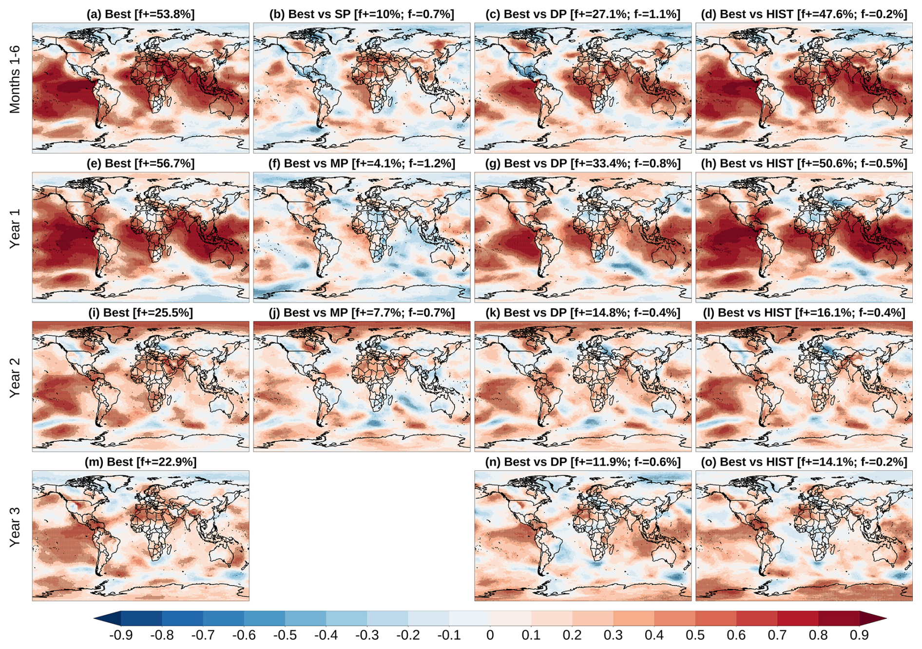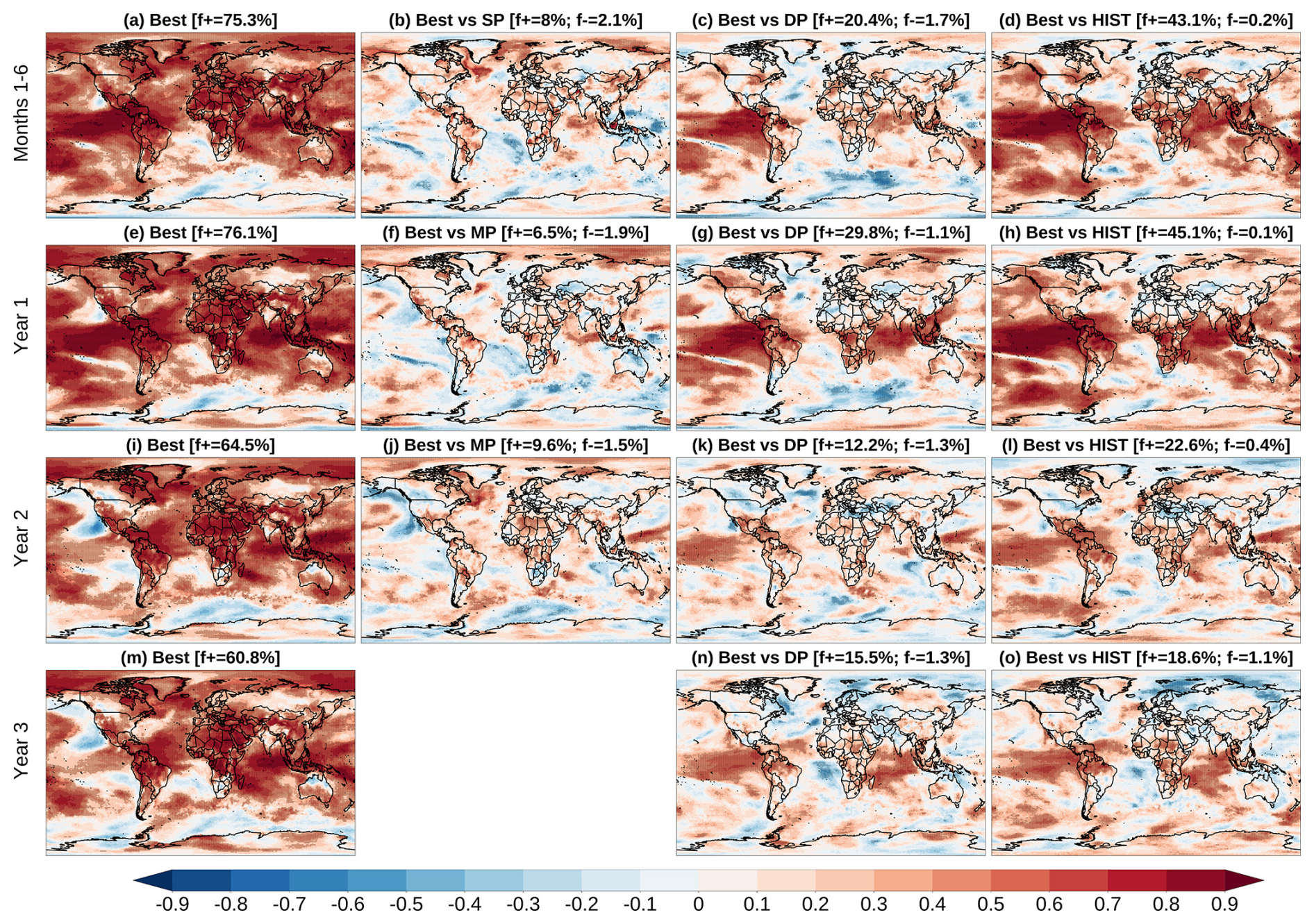 During their overlapping period, the Best and SP ensembles show broadly similar skill for TAS during the forecast months 1–6 (Fig. 3b). Notably, Best is significantly better than SP over 8 % of the region, while SP is better than Best over 2.1 %, as shown with the positive and negative residual correlations, respectively. This relatively small difference indicates that the Best ensemble can be used to issue a seamless forecast directly from its production date (in this case, May), without the need to initially use SP and then switch to Best. However, it is important to note that SP is still required to constrain the DP and/or HIST ensembles to generate the Best ensemble. Similar results are found when comparing Best against MP for the forecast years 1 and 2 (Fig. 3f and j, respectively).