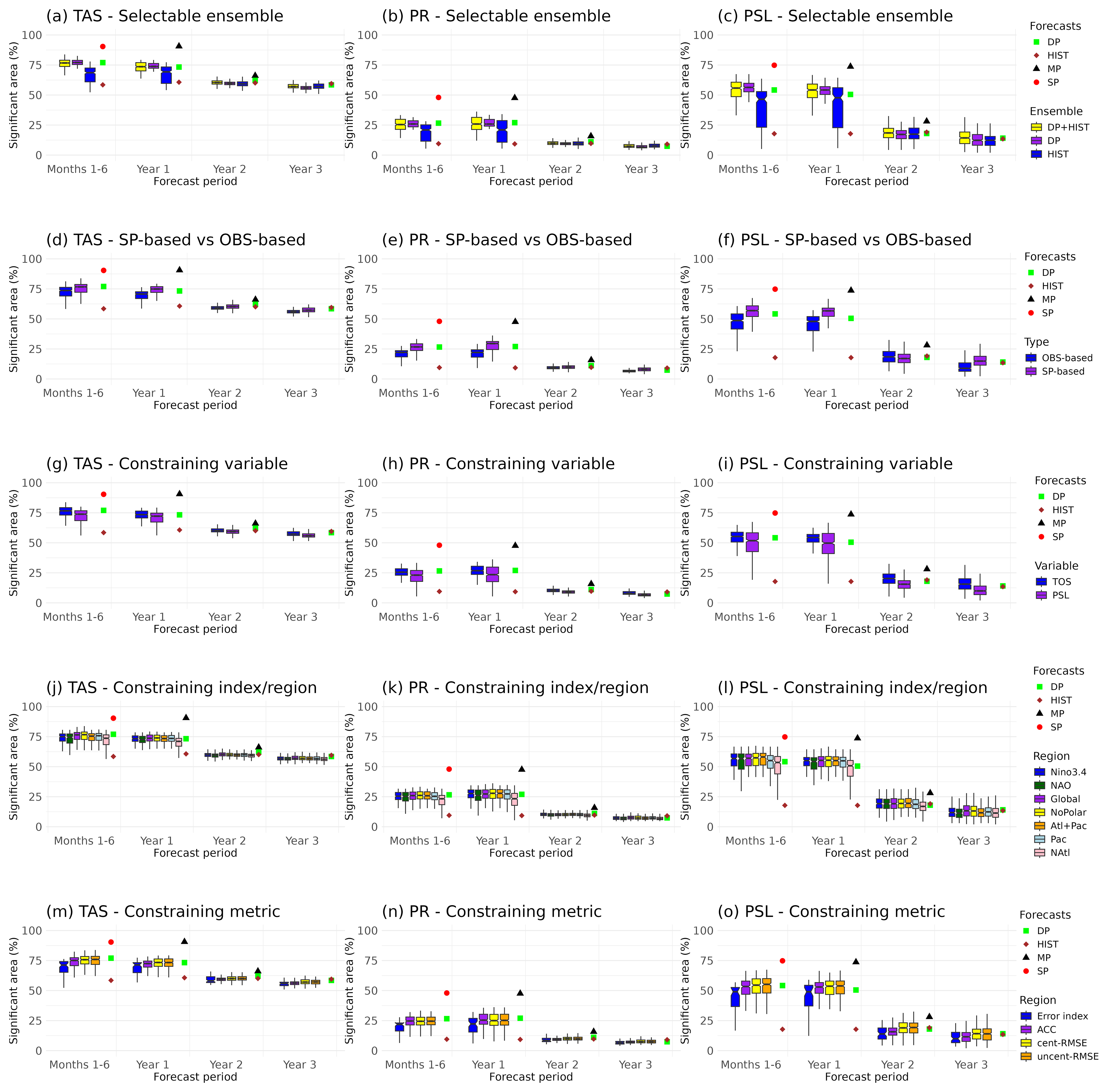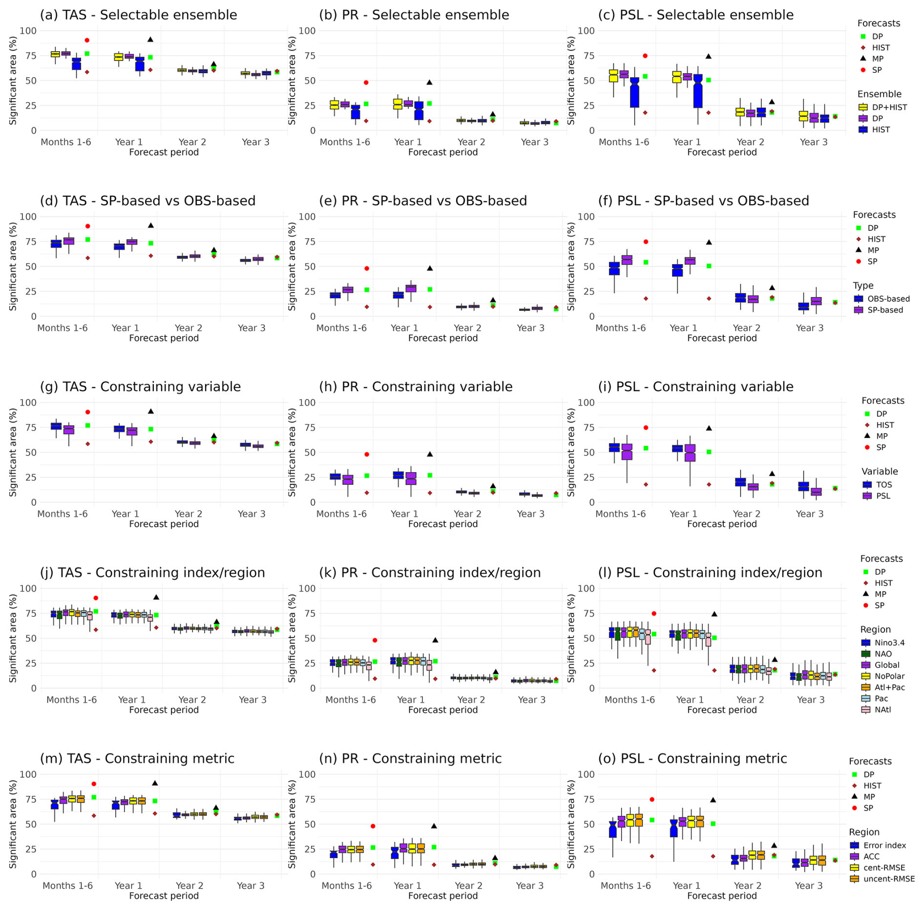 As for the Niño3.4 index, we investigate the sensitivity of the constrained forecast quality to the different constraining choices (e.g. variable, region, metric), and identify the methods providing the highest global skill for TAS, PR and PSL. For each of the 320 constraining methods (see Methods), we calculate the fraction of the global region with significant ACC, and compare subsets of these combinations to assess sensitivity (Fig. 6). For reference, we also include the performance of the unconstrained ensembles (i.e. SP, MP, DP and HIST).