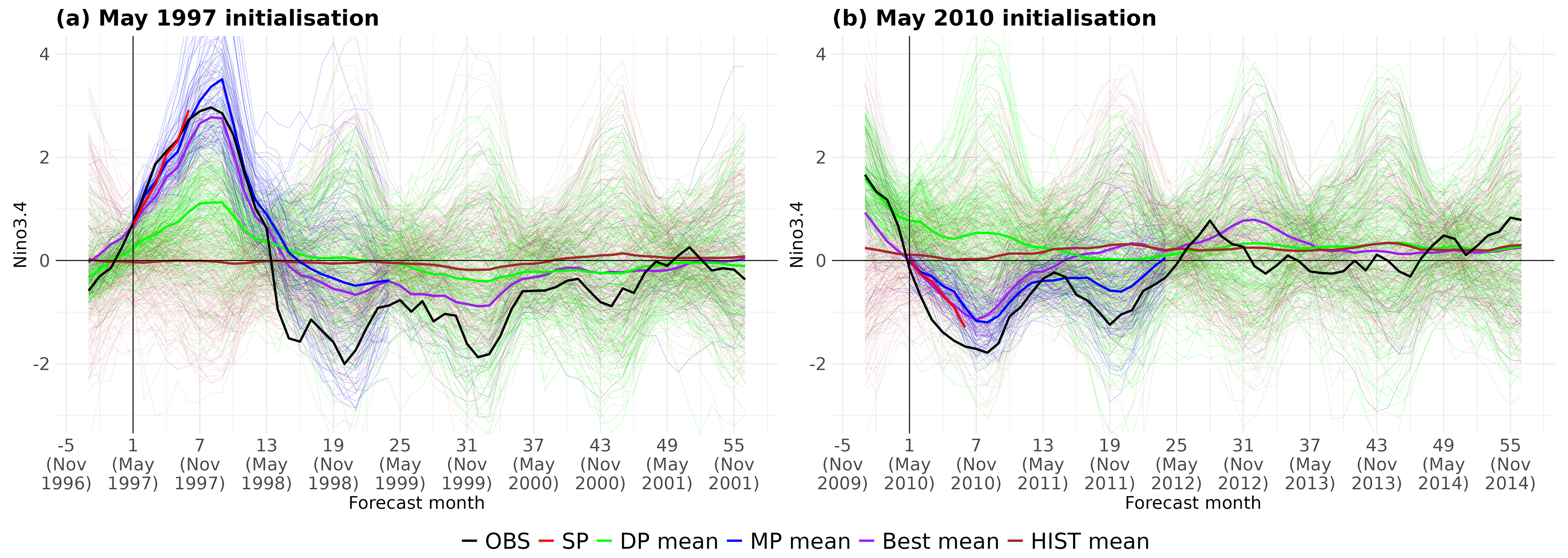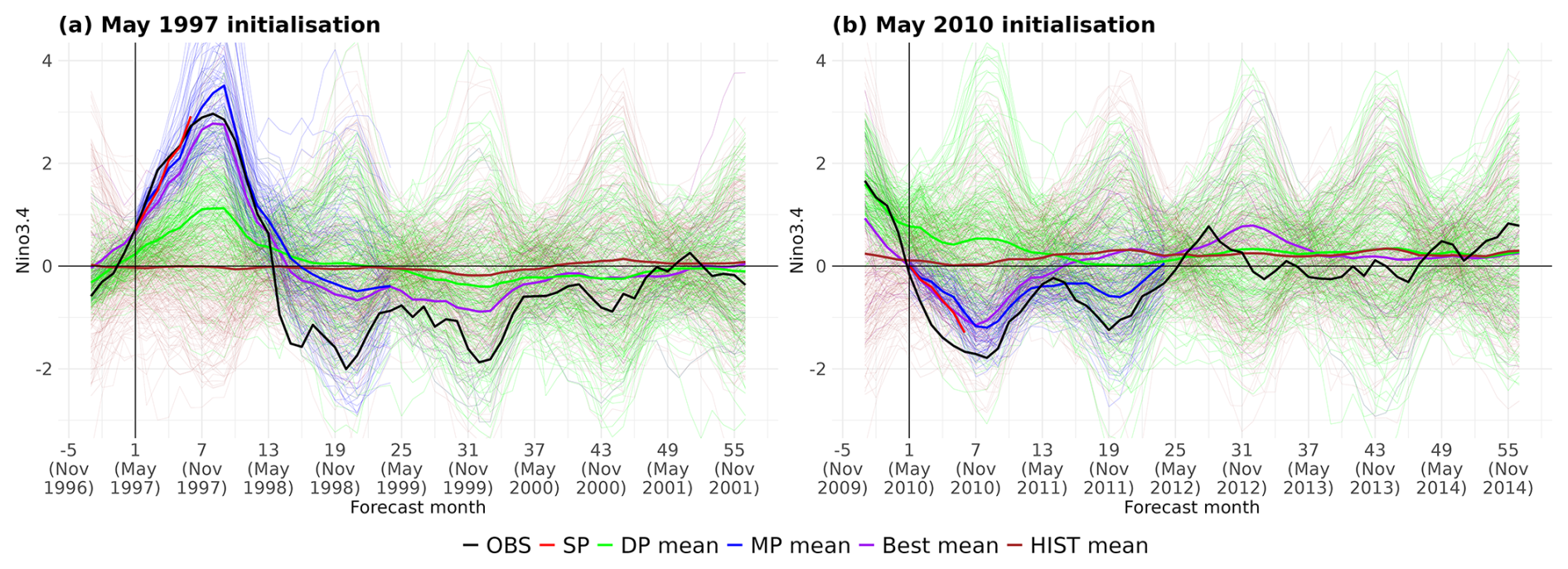 Finally, we present some examples of seamless forecasts to illustrate not only the benefit of the constraining approaches in terms of improved skill, but also their added value in enhancing forecast consistency across timescales. We focus on the forecasts produced in May 1997 and May 2010, which successfully captured the following El Niño and La Niña events, respectively. These two events were selected because they are among the strongest and most impactful ENSO events on record, making them ideal test cases to assess the ability of the methodology to capture key climate signals. Figure 7 shows the observed Niño3.4 index and the different forecasts (i.e. SP, MP, DP, HIST and Best).