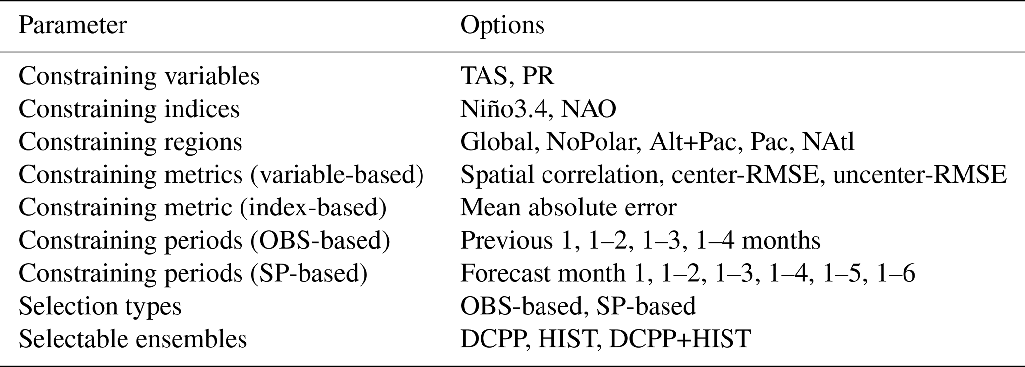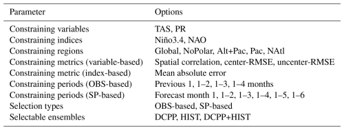 The agreement for the ranking has been computed based on spatial fields of TOS and PSL, and on the Niño3.4 and NAO indices. In case of spatial fields of TOS and PSL, the spatial correlation, centered-RMSE and uncentered-RMSE (Wilks, 2011) are estimated over the Global, Global without the poles (NoPolar), Atlantic and Pacific Oceans (Alt+Pac), Pacific Ocean (Pac) and North Atlantic Ocean (NAtl) regions, as in Mahmood et al. (2021). These regions and their coordinates can be found in Fig. S2 in the Supplement. In the case of Niño3.4 and NAO, the ranking of the members is based on the mean absolute error, inspired by the NAO-matching methodology proposed by Smith et al. (2020). With all the combinations, there are a total of 128 OBS-based constraints (2 indices × 4 months + 2 variables × 4 months × 3 metrics × 5 regions) and 192 SP-based constraints (2 indices × 6 forecast months × 1 metric + 2 variables × 6 forecast months × 3 metrics × 5 regions). This gives a total of 320 constraint-based methods considered. Once the ranking is performed, the best 30 members according to each constraining method are used to build the constrained ensembles (Best). Mahmood et al. (2021, 2022) found robustness of the results to the choice of the number of selected members. A summary of the constraining options can be found in Table 1.