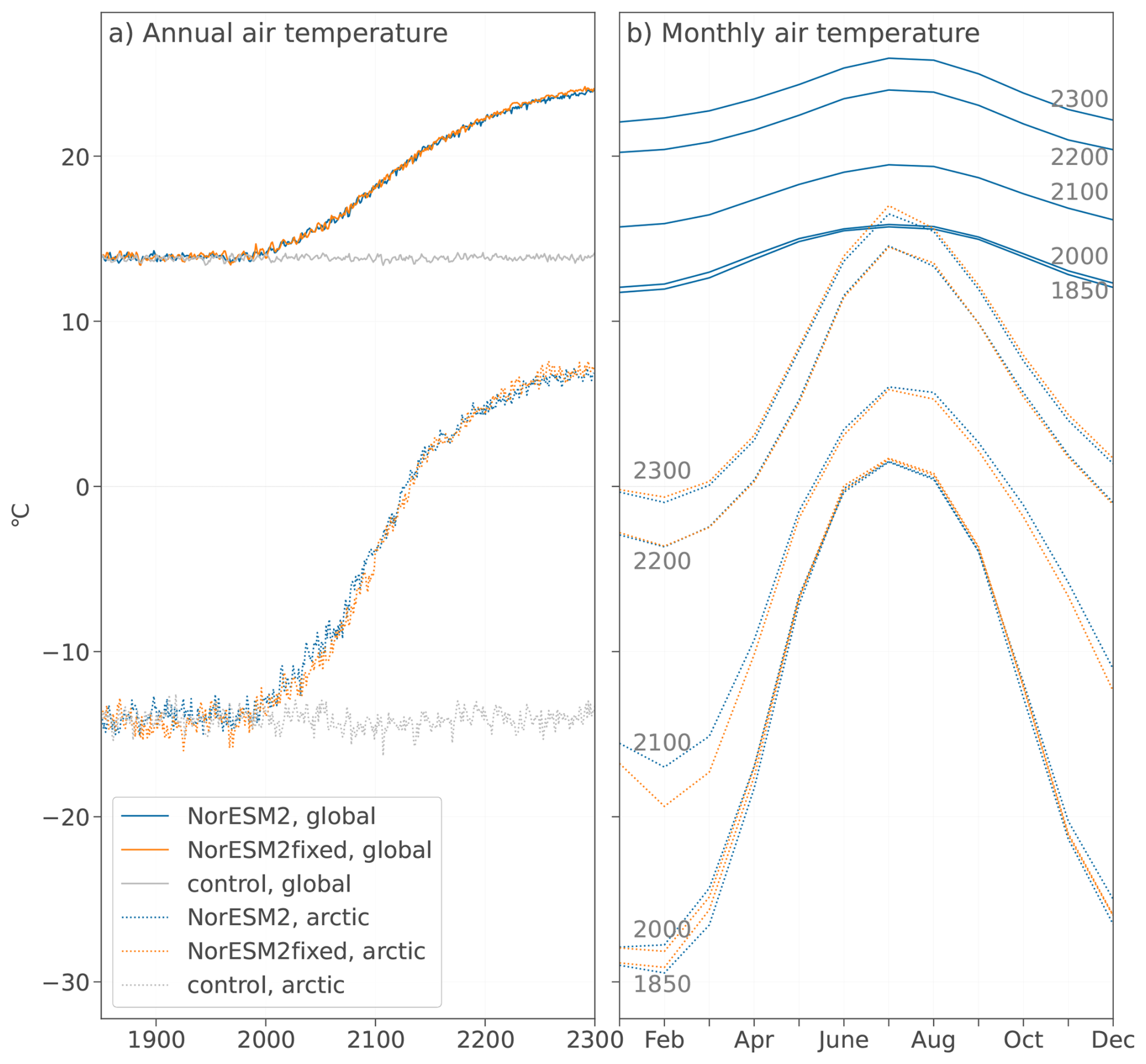 Figure 3Mean global (solid lines) and Arctic (dotted lines) surface air temperatures as (a) annual mean temperatures over the entire simulation time and (b) as monthly means over a 20 year period in 1850s, 2000s, 2100s, 2200s and 2300s. NorESM2 in blue, NorESM2fixed in orange, control in gray. Temperatures are given in °C.