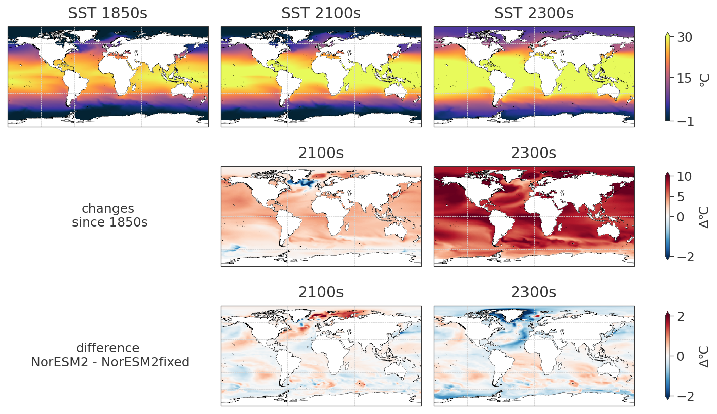 Figure 5Mean annual sea surface temperature evolution shown as absolute values 1850s, 2100s and 2300s for NorESM2 (top row), changes since the start of the simulation for NorESM2 (second row) and as difference between NorESM2 and NorESM2fixed (third row). To cover differences of the initial climate state in NorESM2 and NorESM2fixed, we show double differences here, meaning the difference of the anomaly in 2100s (and 2300s) for NorESM2 and NorESM2fixed.
