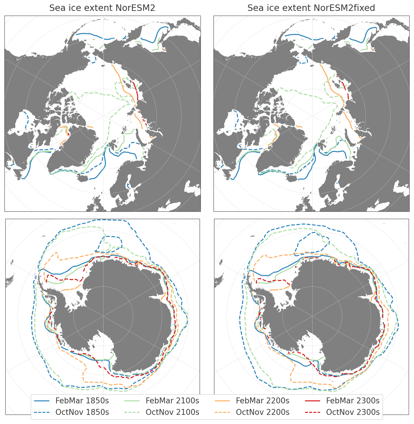 Figure 7Contour of minimum and maximum sea-ice extent covering at least 15 % of the grid cell for northern and southern hemisphere. Northern hemisphere minimum extent (solid line) is taken as the mean of October/November sea-ice coverage and maximum extent (dashed line) is February/March coverage over 20 years in the given period. For southern hemisphere solid and dashed lines mark the same time and show maximum and minimum extend respectively.