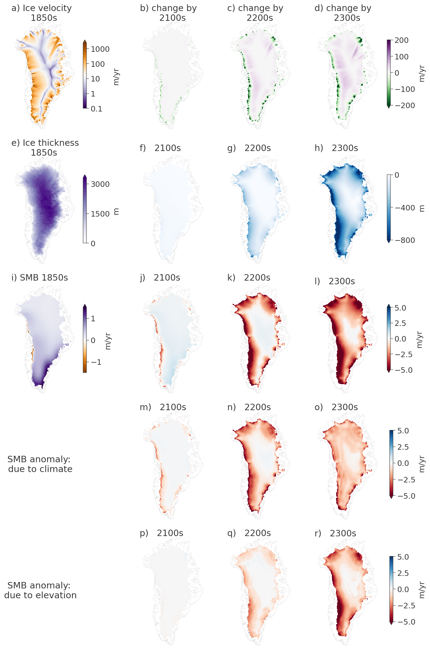 Figure 8Overview of spatial GrIS changes within NorESM2. (a) Initial ice surface velocity (m yr−1) in 1850s and as velocity changes in (b) 2100s, (c) 2200s and (d) 2300s since 1850s. (e) Initial ice thickness (m) in 1850s and as thickness changes in (f) 2100s, (g) 2200s and (h) 2300s since 1850s. (i) Surface mass balance (m yr−1) in 1850s and as anomaly in (j) 2100s, (k) 2200s and (l) 2300s to 1850s. Contribution of climate and elevation to SMB anomaly in (m, p) 2100s, (n, q) 2200s and (o, r) 2300s respectively. Gray outline marks the coast line of Greenland.