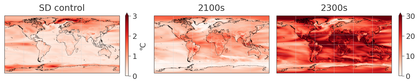 Figure A1Left: SAT standard deviation (SD) of the control run (pre-industrial forcing from 1850 to 2300). Middle and right show the ratio of the absolute SAT changes (by 2100s and 2300s respectively) and the SD of the control run.