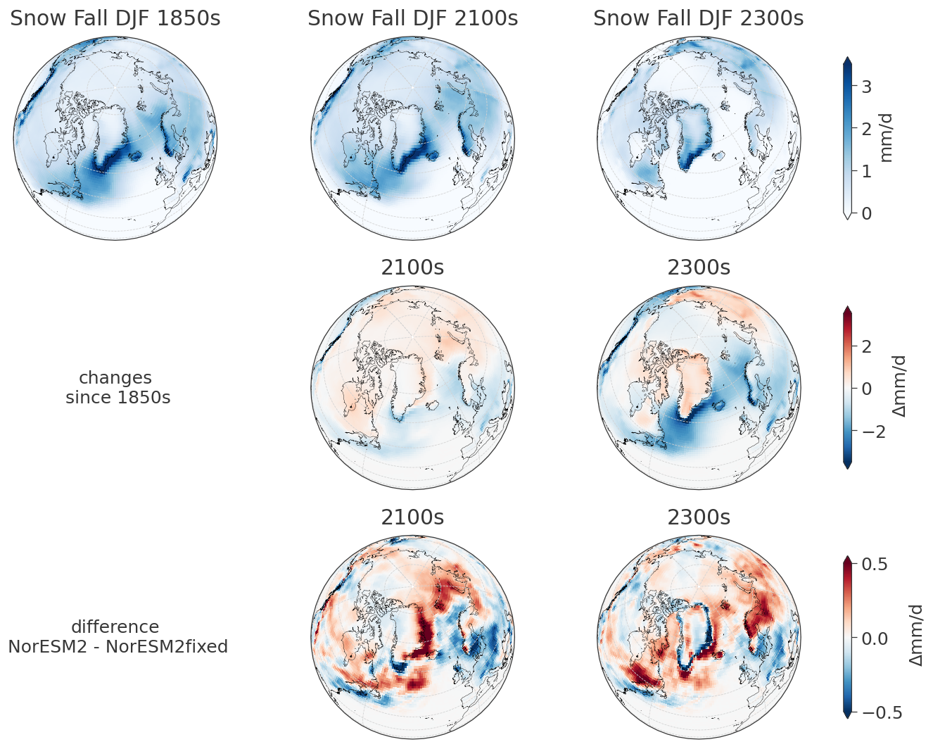 Figure A7Arctic winter (DJF) snow fall with absolute values 1850, 2100 and 2300 for NorESM2 (top row), changes since the start of the simulation for NorESM2 (second row) and as difference between NorESM2 and NorESM2fixed (third row). To cover differences of the initial climate state in NorESM2 and NorESM2fixed, the last row is calculated as double differences, meaning the difference of changes since the 1850s of the respective simulations.
