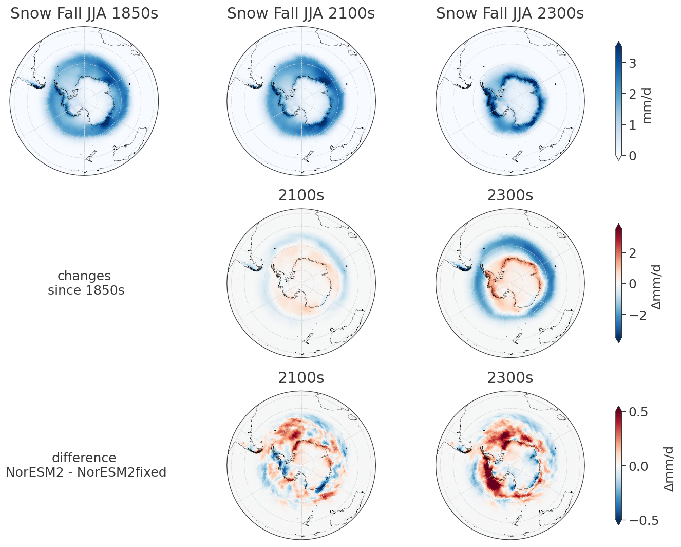 Figure A8Antarctic winter (JJA) snow fall with absolute values 1850, 2100 and 2300 for NorESM2 (top row), changes since the start of the simulation for NorESM2 (second row) and as difference between NorESM2 and NorESM2fixed (third row). To cover differences of the initial climate state in NorESM2 and NorESM2fixed, the last row is calculated as double differences, meaning the difference of changes since the 1850s of the respective simulations.
