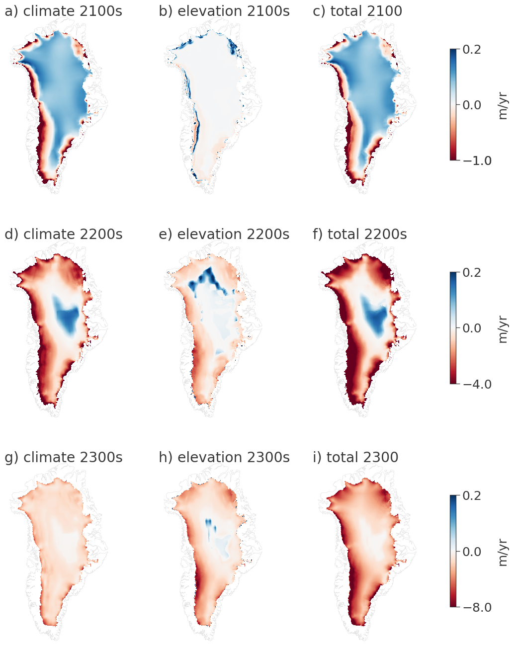 Figure A11Surface mass balance anomalies compared to 1850s of the GrIS as shown in Fig. 8 with different colour limits for each time interval. Surface mass balance anomaly in 2100 due to (a) climate, (b) elevation changes and (c) total anomaly. For 2200s and 2300s accordingly: with climate contribution to SMB anomaly in (d) 2200s and (g) 2300s. SMB changes since 1850s due to ice sheet elevation changes in (e) 2200s and (h) 2300s. Total SMB anomaly since 1850s in (f) 2200s and (i) 2300s. Gray outline marks the outline of Greenland.
