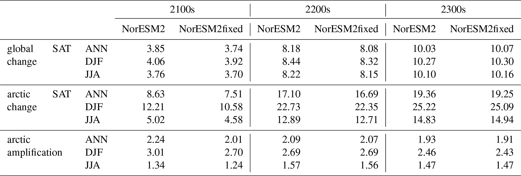 This change happens mainly between 2000s and 2200s with global mean SAT increase by 0.1, 3.8, 4.3 and 1.9 °C between 1850s and 2000s, and the next centuries respectively. For the Arctic, the biggest steps in SAT increase happen as well between 2000s and 2200s with changes of −0.4, 5.4, 7.8 and 1.9 °C over the arctic summers (JJA) of each century and with 0.9, 11.3, 10.5 and 2.5 °C over winter (DJF) during the same time periods (Fig. 3 and Table 1). The NorESM2fixed simulation shows the same seasonal evolution patterns except for the Arctic SAT in 2100s where DJF SAT are 1.6 °C below NorESM2 and 0.3 °C below in JJA. By 2200s, SAT reach the same level in NorESM2fixed and NorESM2. The difference in global and Arctic temperature changes is usually expressed by Arctic (or polar) amplification, e.g. the ratio of changes of Arctic SAT versus global SAT. Polar amplification together with climate sensitivity of the model is an important control on the Greenland ice sheet mass loss within a simulation and shows how quickly the Greenland ice sheet mass changes are impacted by CO2 increase (Fyke et al., 2014; Hofer et al., 2020; Xie et al., 2022). The Arctic amplification by 2100s in NorESM2 is with 2.2 larger than in NorESM2fixed (2.0). By 2300s however, values are almost the same with 1.91 and 1.93 (Table 1).