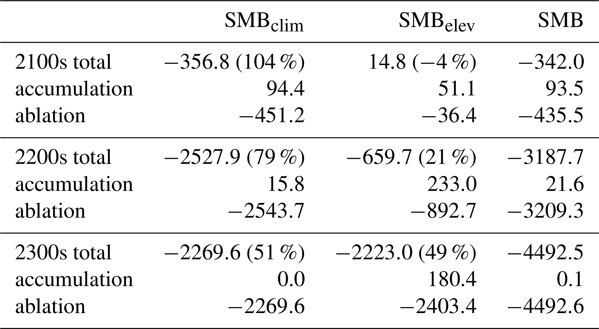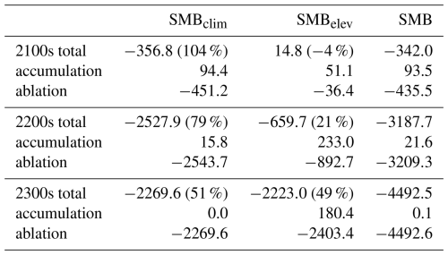 In 2100s, the warming climate dominates the SMB changes and ice surface elevation changes are minor until this point and contribute as SMB increase to the total SMB change (Table 2). In 2200s, the elevation changes are amplifying the melt around the ice margins and also introduces increased snow fall in the North. From 2200s to 2300s, the melt due to elevation feedback overtakes the melt amount due to climate around the ice margins. While in 2200, the elevation feedback contributes 21 % to the negative SMB, in 2300 SMBelev is gaining on impact and contributes to almost 50 % of the SMB. At the end of the simulation, climate and elevation-feedback play an almost equally important role for the SMB. This shows the importance of coupling ice and climate models after 2100. For more detailed evaluation of the historic surface mass balance we refer to Goelzer et al. (2025).