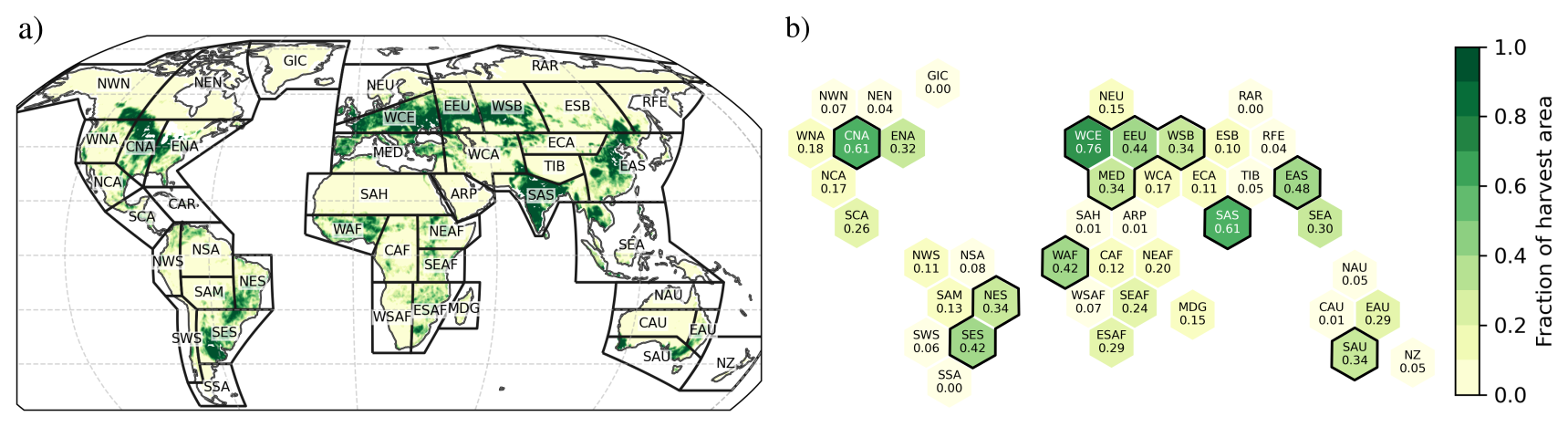 We make use of the IPCC AR6 WG1 Land reference regions (Iturbide et al., 2020) to apply regionally integrated statistics. Our main focus are regions with a significant amount of crop production and agricultural land use. We identified these regions by their relative amount of harvest area in 2010 according to the GFSAD1KCM dataset (Teluguntla et al., 2016). Figure 1 shows a regridded combination of major and minor rain-fed and irrigated harvest area masks. The reference regions are shown as overlay in panel (a). Panel (b) shows the relative amount of harvest area for each region. Regions above 33.3 % harvest area are considered as highly relevant for agriculture throughout this study. The agricultural most relevant regions are namely Western&Central-Europe (WCE), C. North-America (CNA), S. Asia (SAS), E. Asia (EAS), E. Europe (EEU), Western-Africa (WAF), S. E. South-America (SES), W. Siberia (WSB), Mediterranean (MED), N. E. South-America (NES), S. Australia (SAU). They are highlighted in Fig. 1b.