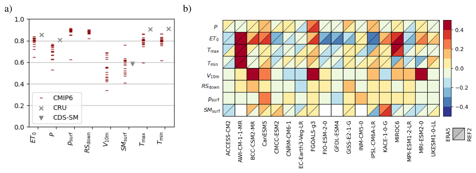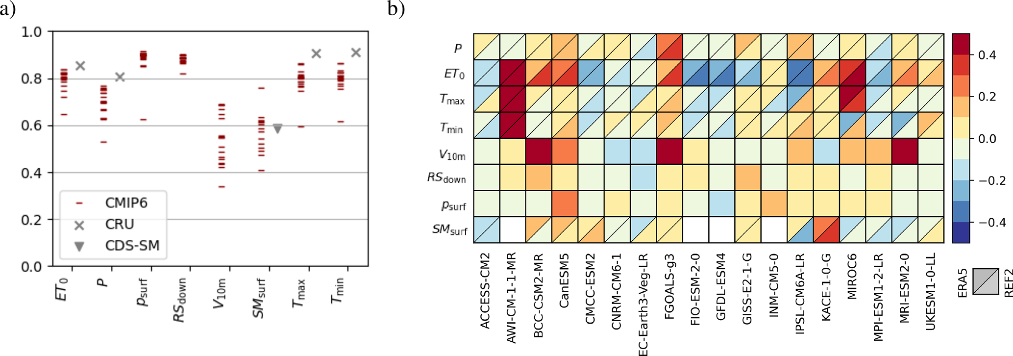 Figure 2Overview of the CMIP6 multi-model performance compared to ERA5 reanalysis over land surface. In panel (a) pattern correlation of historical CMIP6 simulations with ERA5 for precipitation (P), reference evapotranspiration ET0, daily minimum and maximum temperature (Tmin, Tmax), wind speed at 10 m (V10 m), surface down welling shortwave radiation (RSdown), surface pressure (psurf) and soil moisture (SMsurf) are shown. The data is averaged over the period 1980 to 2014. The additional markers show pattern correlation of ERA5 to CRU and CDS-SM. In panel (b) the relative model performance for the same variables is shown. The root mean squared distance (RMSD) of each model to ERA5 is centered and normalized at the median RMSD. Negative (blue) values indicate that the model predicts results more similar with ERA5 compared to the other models. Red colors indicate worse performance. For some variables the performance compared to CRU is shown as well in the bottom right triangle. The alternative reference dataset for SMsurf is CDS-SM.