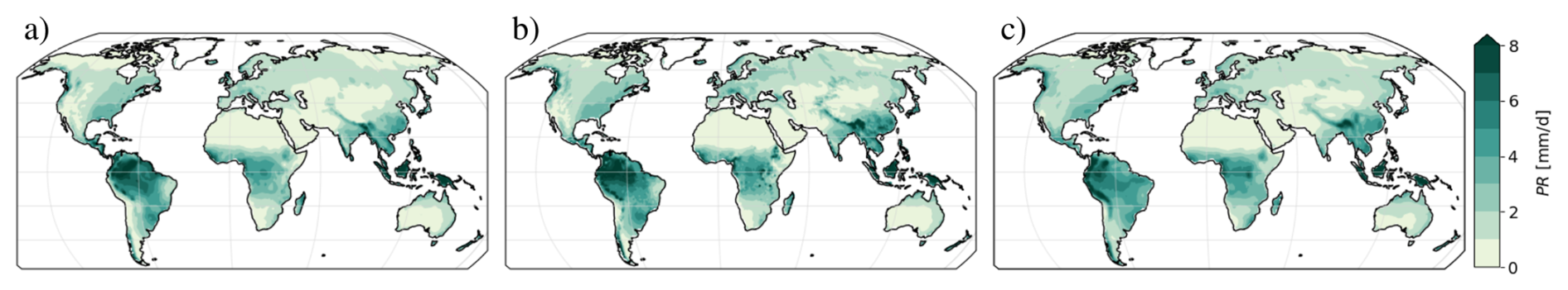 Figure 3Global pattern of temporal mean precipitation based on (a) ERA5, (b) CRU and (c) CMIP6 multi-model mean over the period 1980–2014.