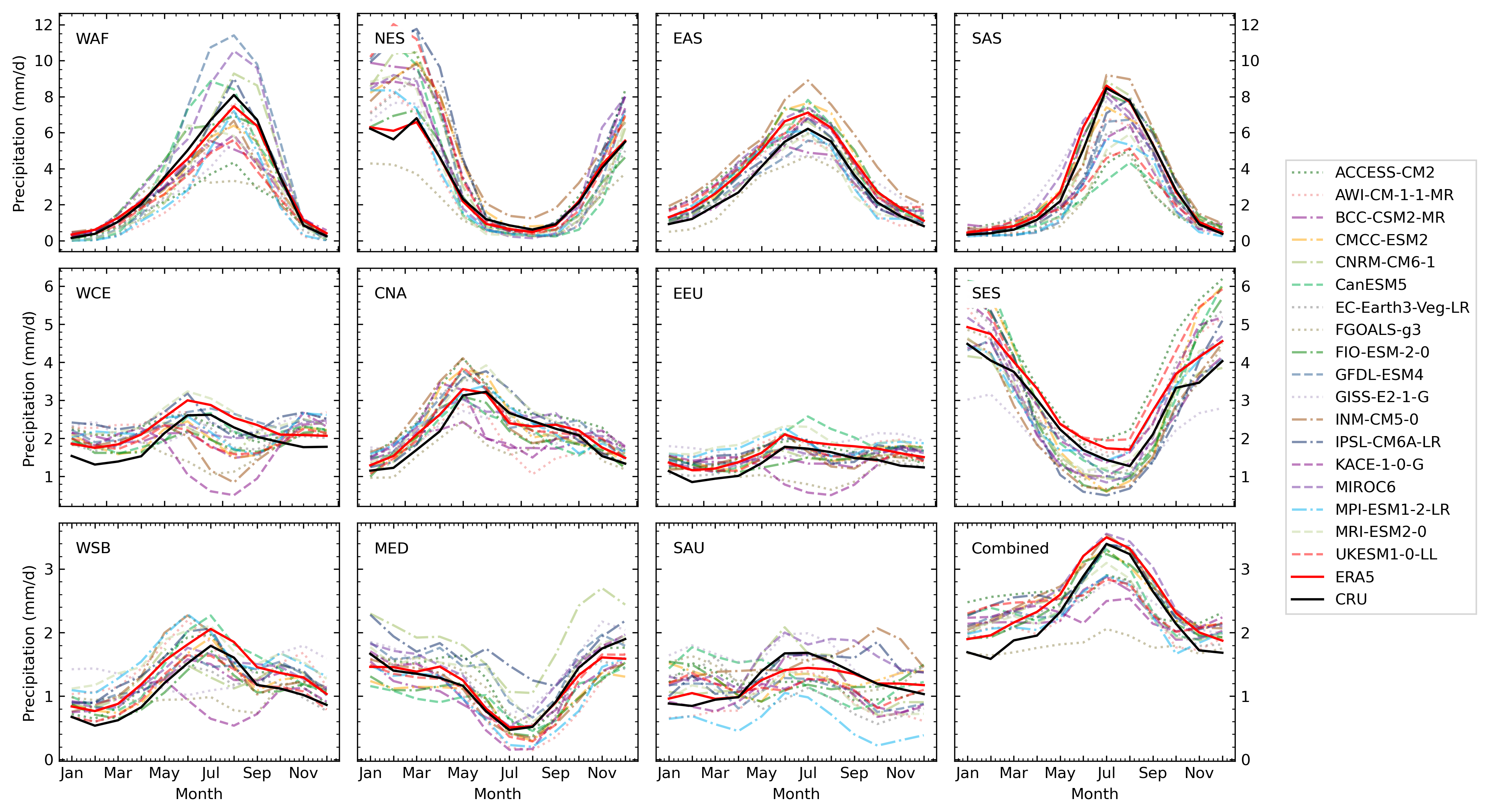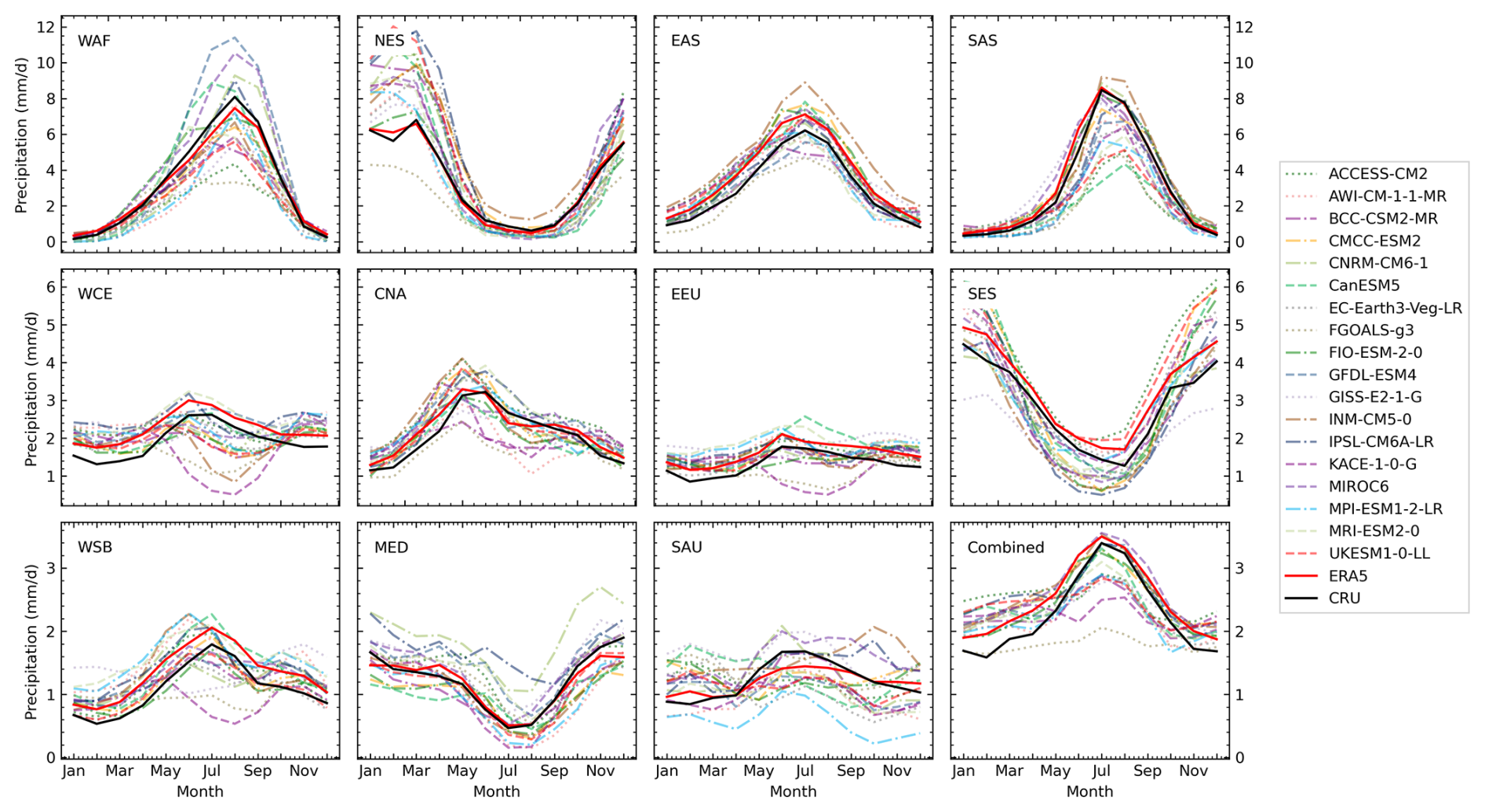 All simulations for regions of Northern Hemisphere summer monsoon – Western-Africa (WAF), Eastern-Asia (EAS) and Southern-Asia (SAS) – agree in less than 1 mm d−1 precipitation in the winter months (DJF) and maximum precipitation during the summer (JJA). For WAF the average August precipitation spreads throughout 3 mm d−1 (FGOALS-g3) and 11.5 mm d−1 (GFDL-ESM4), with most simulations being closer to the reanalysis around 7.5 mm d−1. For SAS the precipitation during JJA is slightly underestimated by many models. The highest discrepancy to ERA5 and CRU is found in CanESM5 with 4 mm d−1 less precipitation in July. EAS seasonal cycle is captured by all simulations within a maximum distance of 2 mm d−1 to ERA5 or CRU.