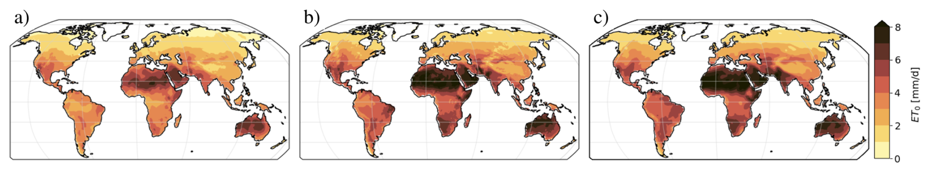 Figure 5Global pattern of temporal mean of reference evapotranspiration (ET0) based on (a) ERA5, (b) CRU and (c) CMIP6 multi-model mean over the period 1980–2014. For CRU the variable is taken from the dataset. For ERA5 and CMIP6 ET0 is calculated from other atmospheric variables (Eq. 1) similar to the method used for CRU.