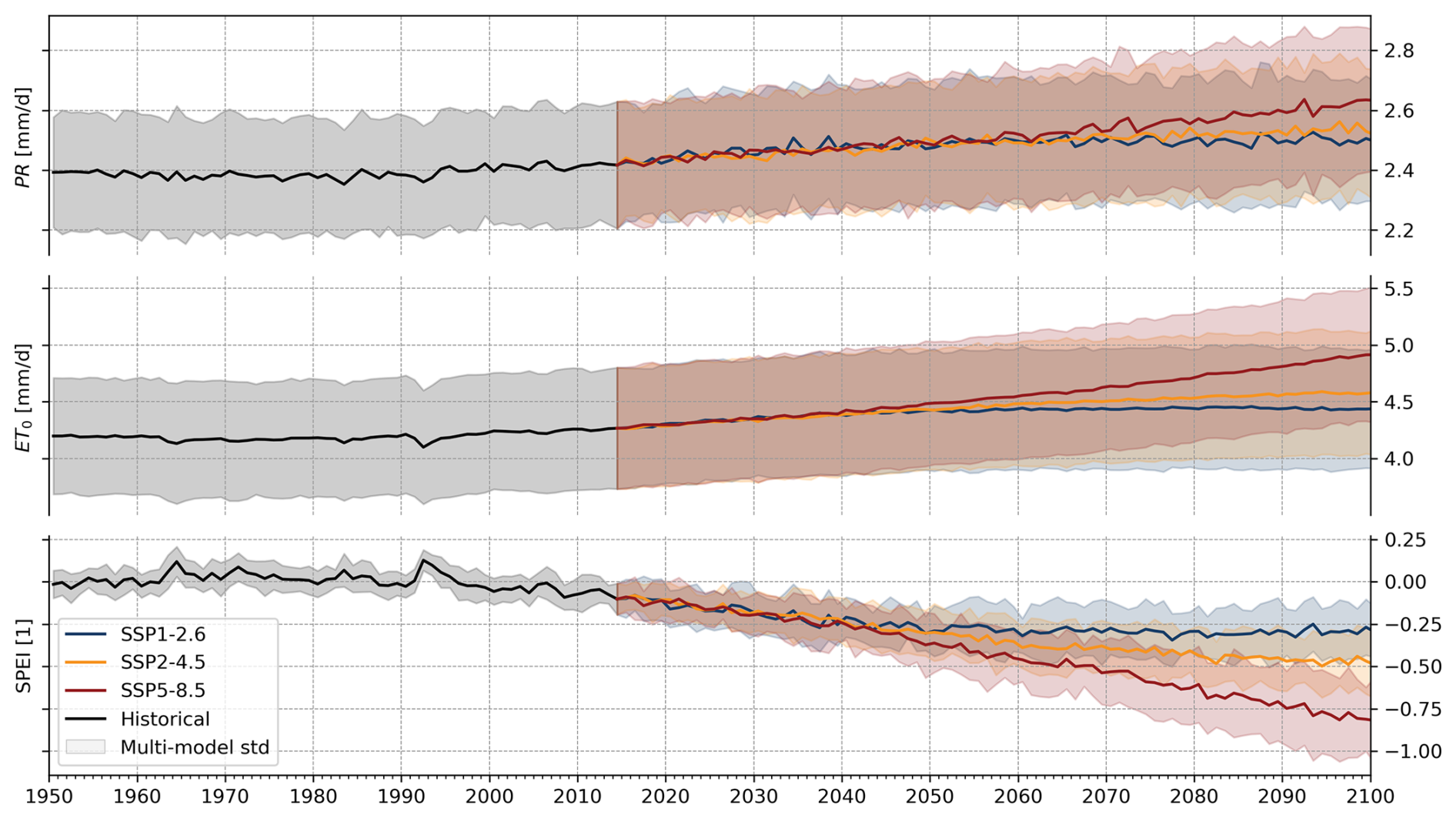 Figure 6Annual precipitation, reference evapotranspiration and the derived SPEI. All variables are averaged over global land surface. The multi-model means of 18 CMIP6 models are drawn as solid lines, with shaded areas indicating the multi-model standard deviation. For the period (2015–2100) different future scenarios can be distinguished by color.