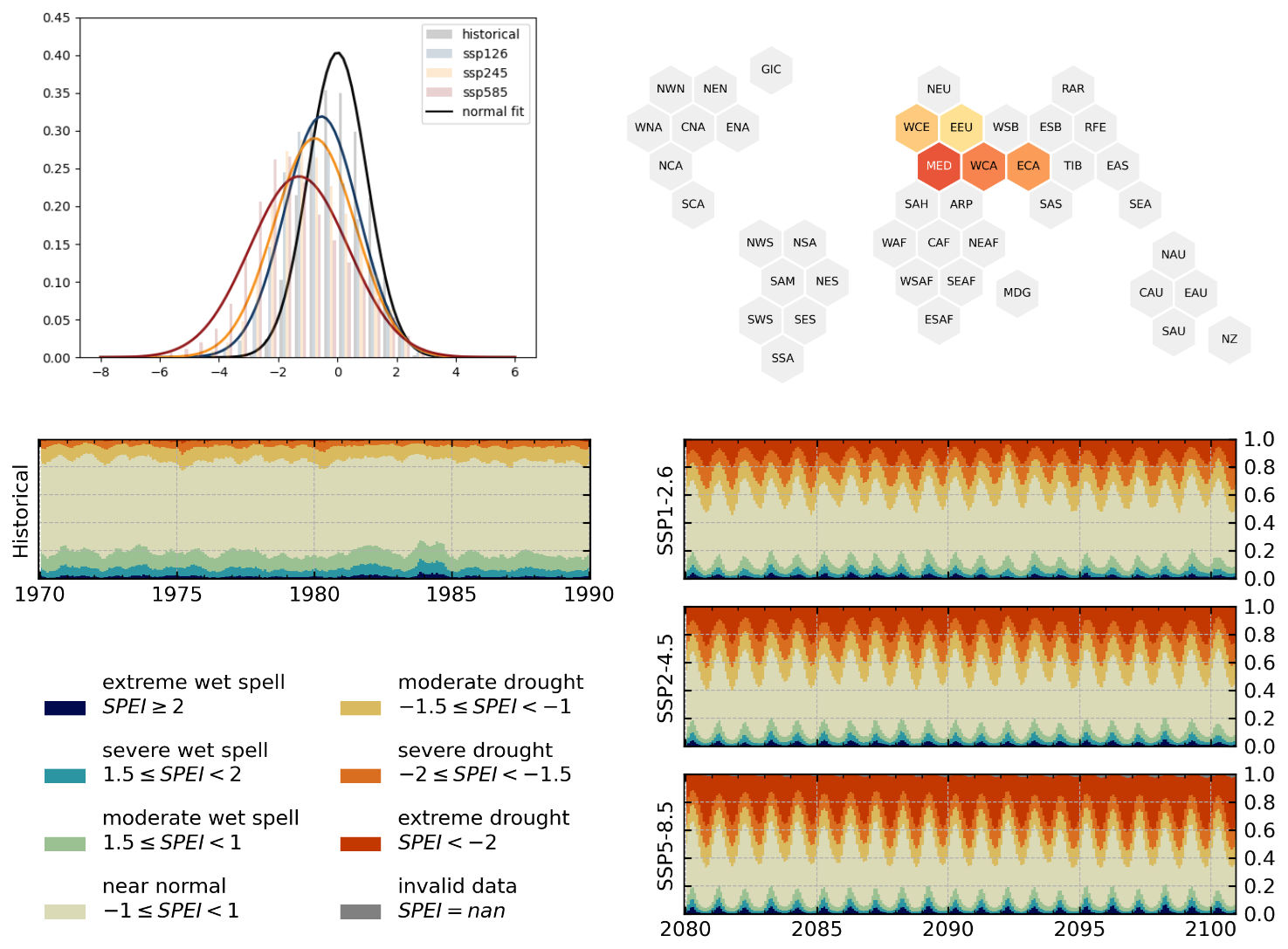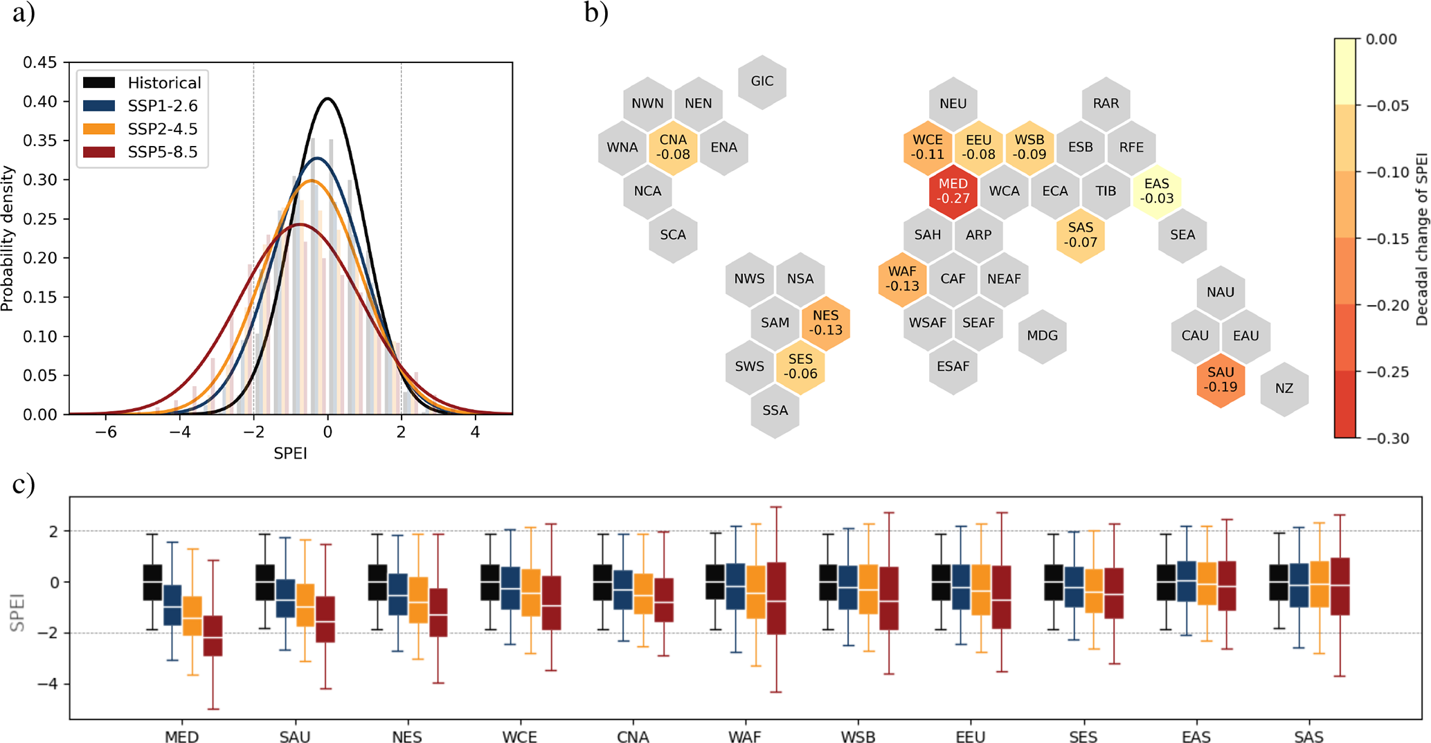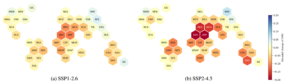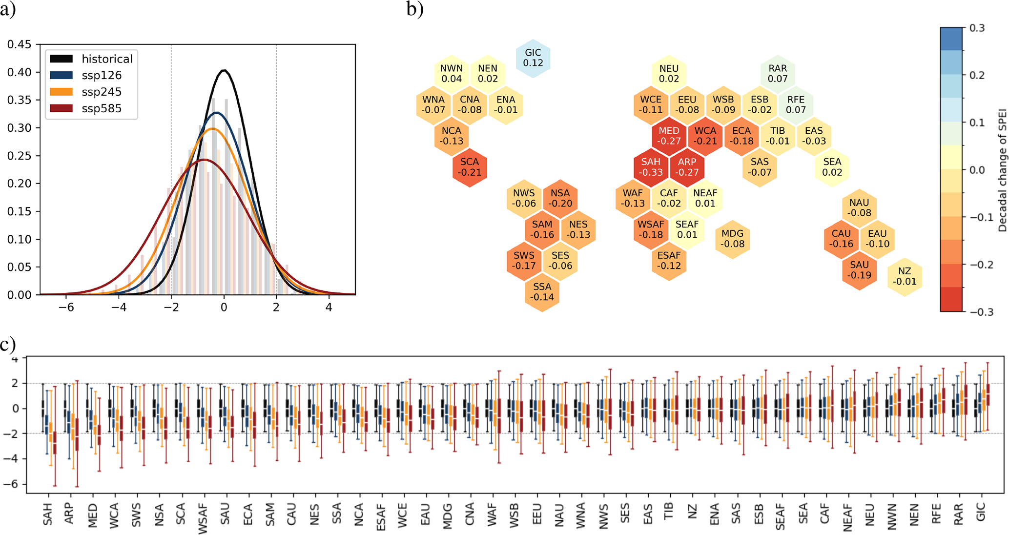 The hexagons in panel (b) are shown to provide a spatial overview of the regions and their projected SPEI decadal change in the SSP5-8.5 scenario. Due to the symmetric Gaussian distribution of the SPEI the decadal change of the mean is roughly proportional to the shift of the distribution. Similar to Fig. 7 the lower emission scenarios SSP1-2.6 and SSP2-4.5 show smaller change rates (Fig. A6) but qualitatively agree with Fig. 8b for most regions.