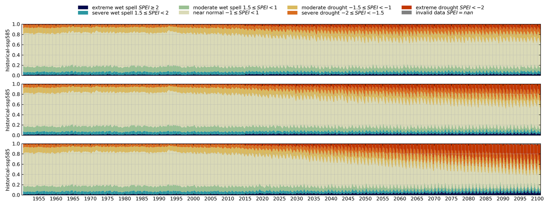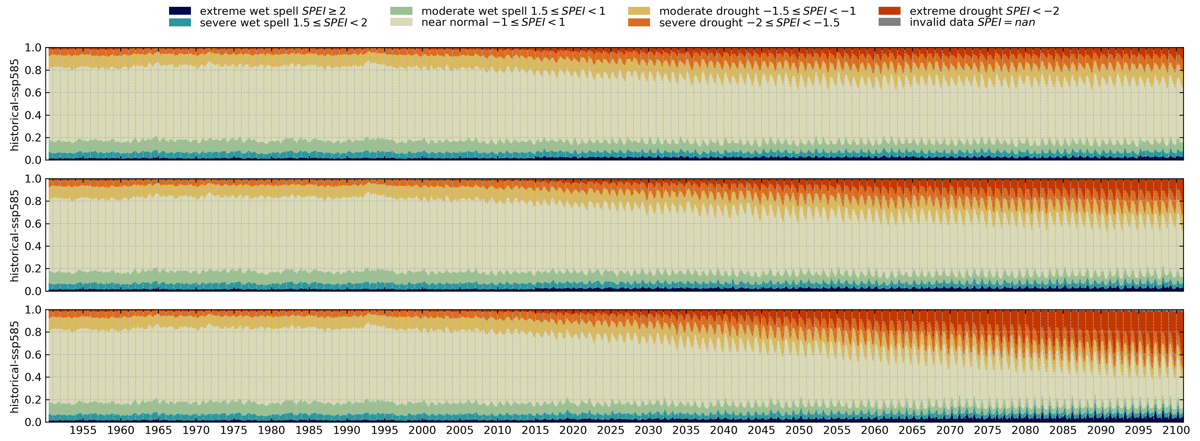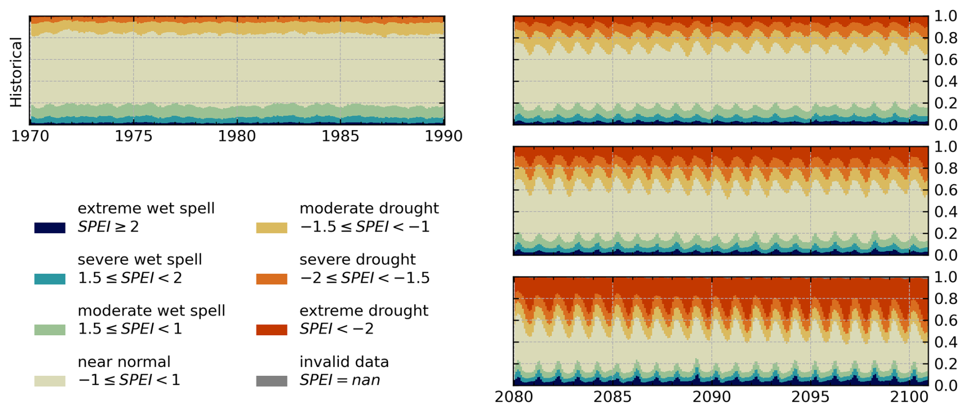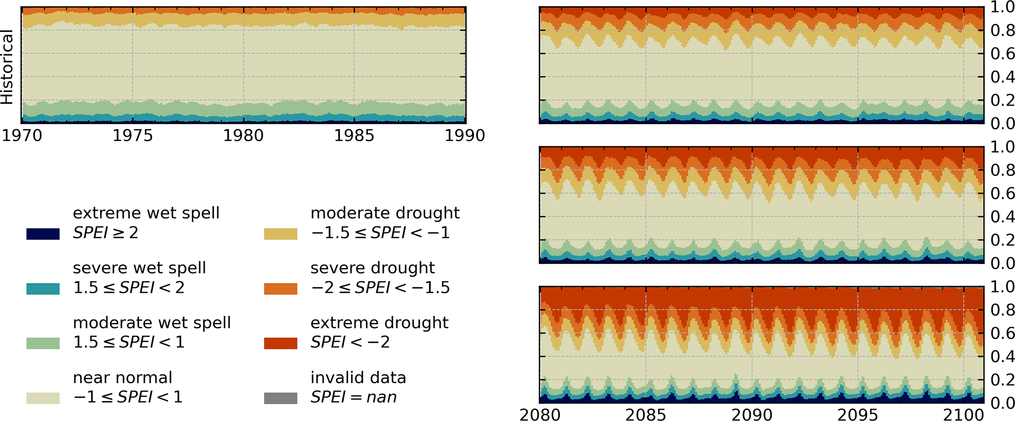 Using the ability of the SPEI to assign a category for the severity of drought based on climatic conditions we calculated the area that is covered by drought conditions of a certain category at any time. This allows us to quantify the relative area that might be affected by droughts under changing atmospheric conditions in future projections as given in Eq. (7).