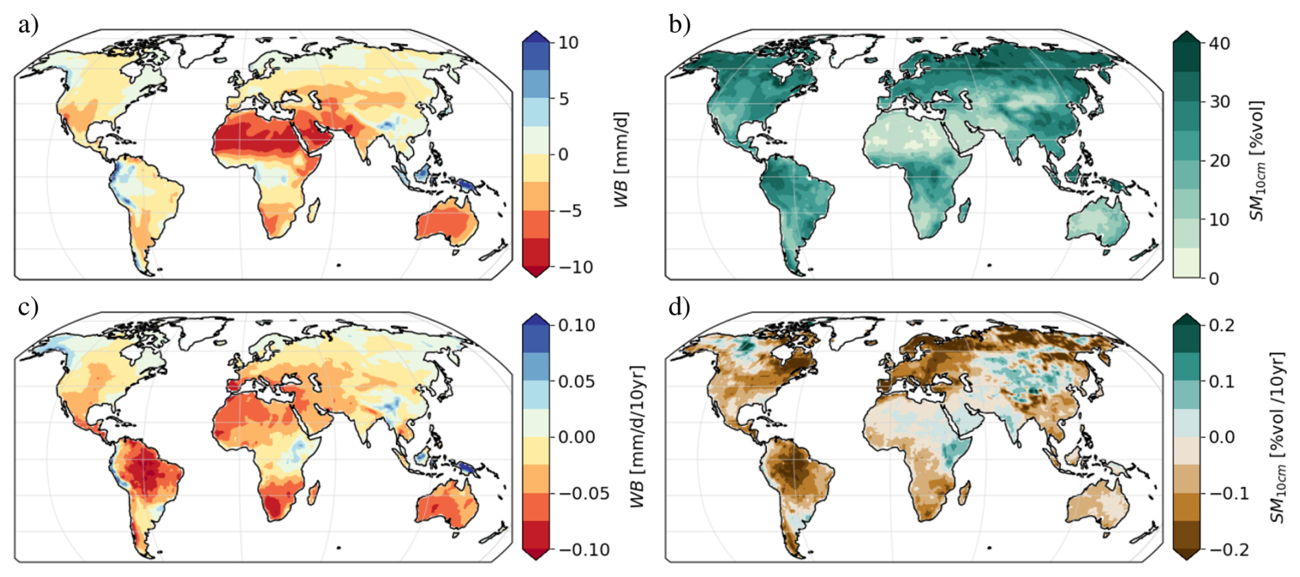 In addition to the ERA5 dataset we use the Climatic Research Unit (CRU) gridded Time Series version 4.07 (TS4.07) alternative reference for temperature and precipitation in the evaluation process (Harris et al., 2020). The CRU dataset also provides approximated ET0 based on the Penman-Monteith equation, similar to Eq. (1). Using pre-calculated ET0 values in one reference dataset also serves as a sanity check for the implementation of Eq. (1). For soil moisture the CDS's combined satellite dataset (CDS-SM; Dorigo et al., 2019) is used. The dataset is blended from a set of passive (starting 1978) and active (starting 1991) microwave measurements with a resolution of 0.25 °. A detailed list of used sensors can be found in the datasets user guide (Preimesberger et al., 2025).