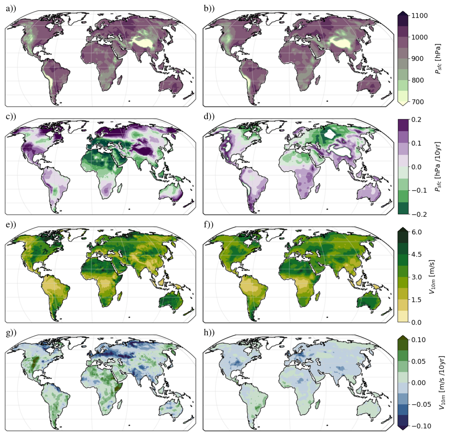 Figure A2Global pattern of temporal mean (a, b, e, f) and average decadal change (c, d, g, h) of surface pressure psfc (a–d) and wind speed at 10 m (e–g) based on ERA5-Land (a, c, e, g) and CMIP6 multi-model mean (b, d, f) over the period 1950–2014.