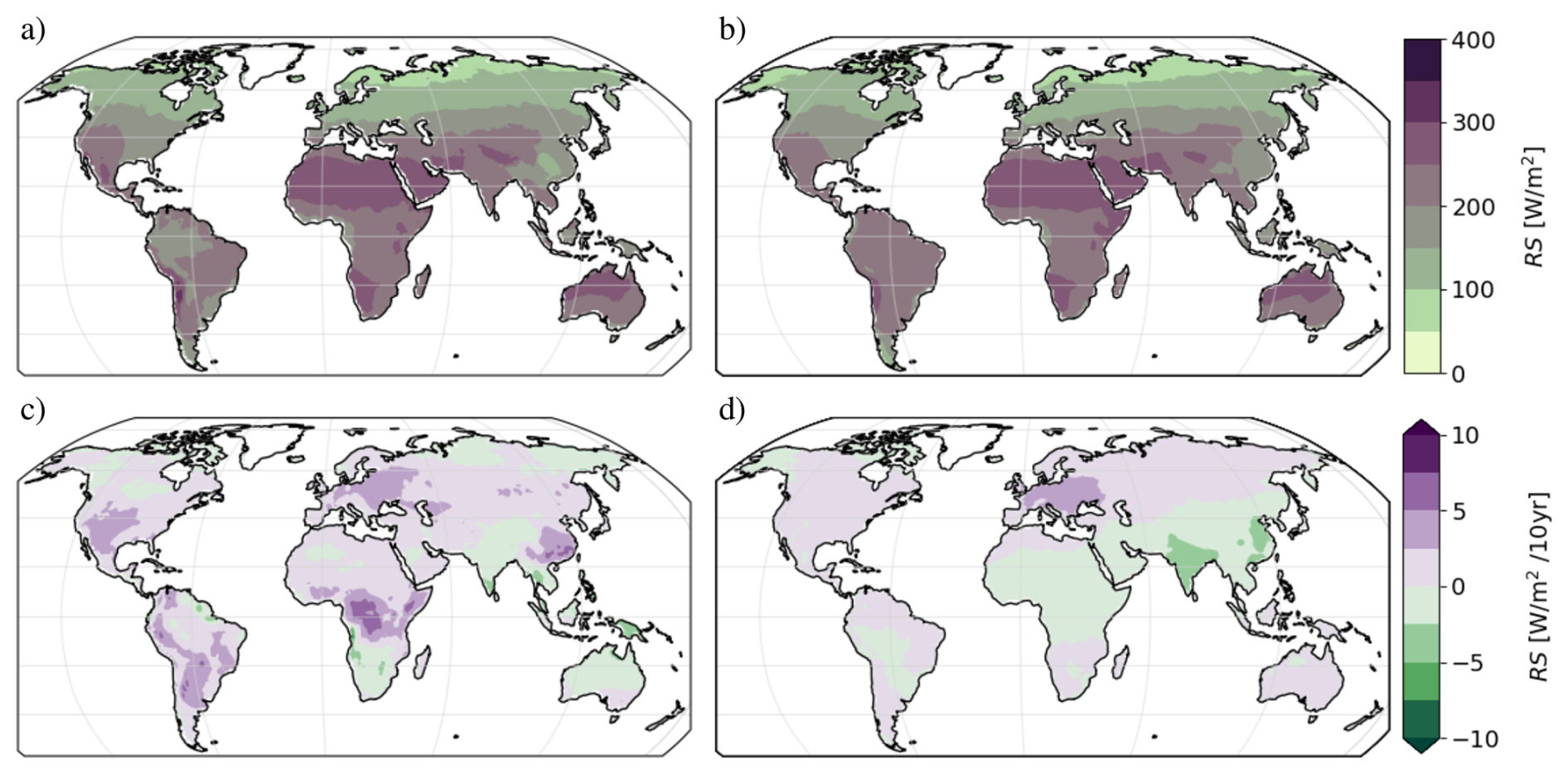 Figure A3Global pattern of temporal mean (a, b) and average change (c, d) of downward surface solar radiation based on ERA5 and CMIP6 multi-model mean over the period 1979–2014.