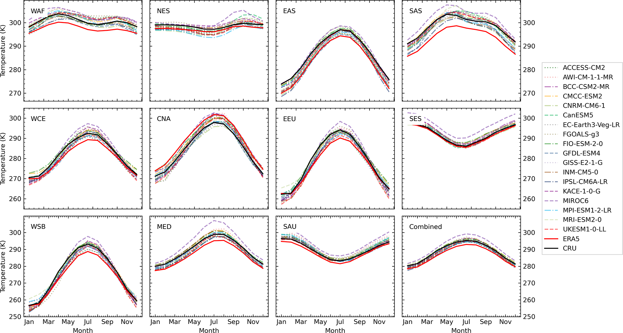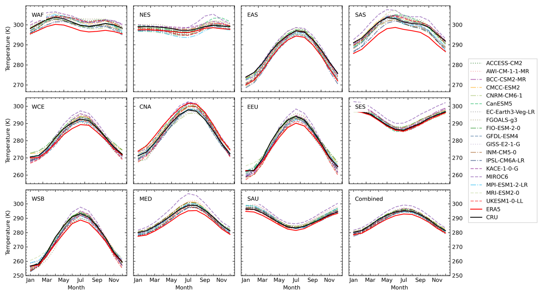 Figure A4Seasonal cycles of average temperature at 2 m height for historical simulations of 18 CMIP6 models and two reference datasets calculated over the time period 1980–2014. The shown temperature is the average of monthly mean values of daily minimum and maximum temperature.