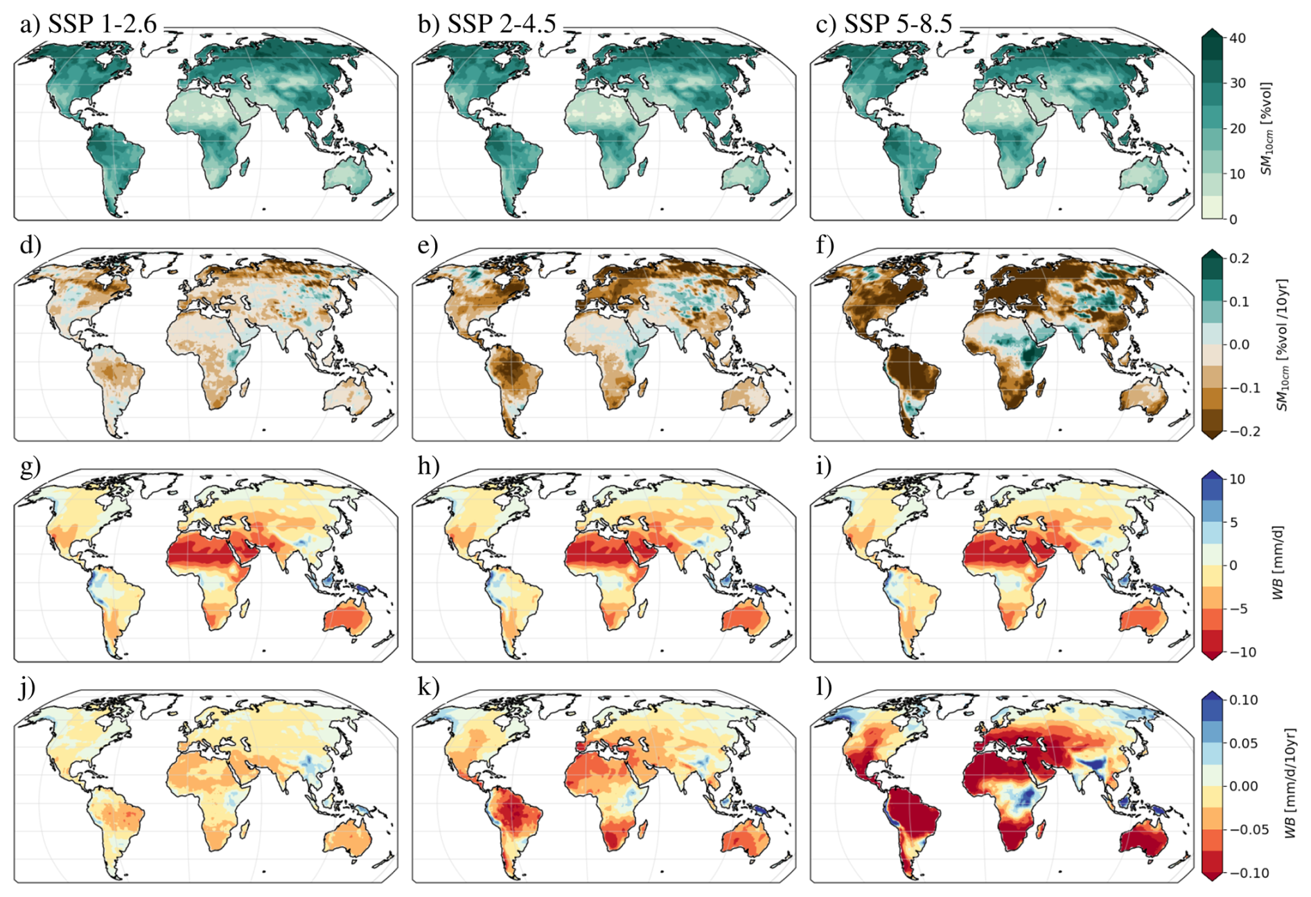 Figure A5Change rate and average of soil moisture (a–f) and water budget (g–l) in different future scenarios (a, d, g, j: SSP1-2.6, b, e, h, k: SSP2-4.5, c, f, i, l: SSP5-8.5) from 2015–2100.