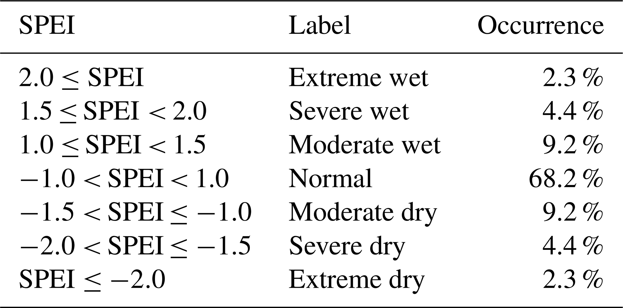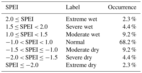 Table 1Mapping of SPEI values to their category and occurrence. These probabilities are used to fit the probability function used by the SPEI (Vicente-Serrano et al., 2010). SPEI values between 0 and −1 for the SPEI have originally been labeled as mild droughts, but are considered as normal for simplification (McKee et al., 1993).