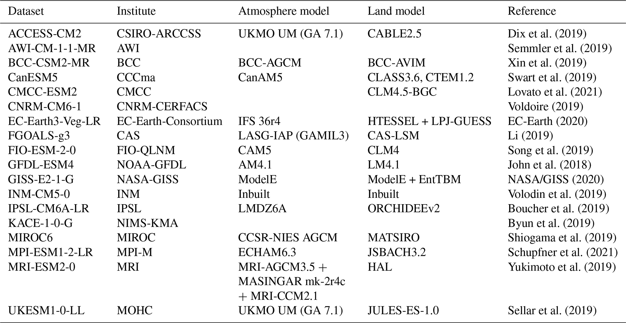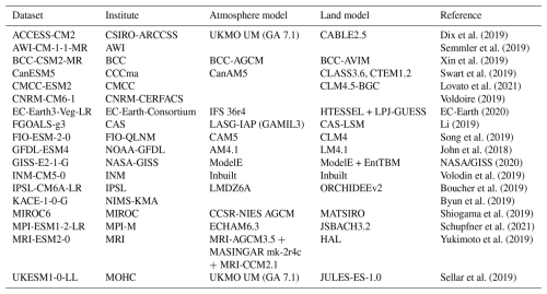 The minimum requirement for a model to be included in this study was the availability of all variables required to calculate the reference evapotranspiration (wind speed, surface pressure, total cloud cover, daily minimum and maximum temperature) and precipitation. We limited the selection to only one model per institute, to account each ESMs atmosphere and land component only once. The final selection of models is listed with some additional information in Table 2. Relative humidity is not considered as a selection requirement because we found that we get similar results by approximating actual vapor pressure as following Allen et al. (1998, Eq. 48).