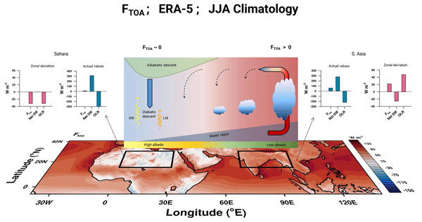 Energetics of monsoons and deserts: role of surface albedo vs water vapor feedback